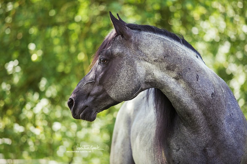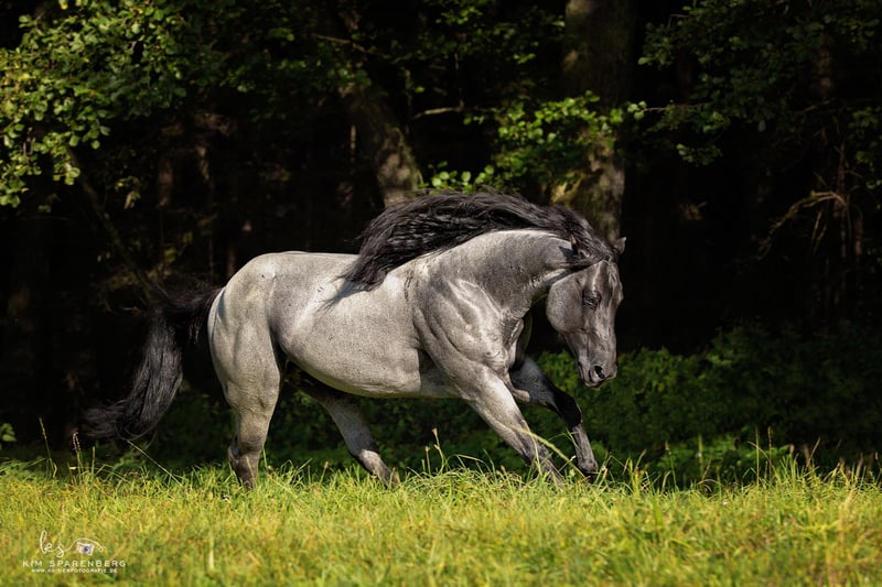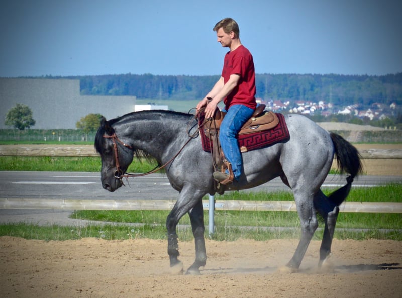 YOU AIN'T RIDING UNTIL YOU'RE RIDING A HANCOCK .... this is an open secret among US ranchers. In the USA they are bred for the "every day ranch work" and for competitions like Team Roping and Ranch Versatility. In Europe extremely rare bloodline, which stands for endurance, robustness, nerve strength, extremely strong bones and hard hooves. Our MJM Saltys Blue Ezra is a worthy representative of this bloodline. We imported it from the USA to make these original features of a quarter available again in German-speaking countries. As the previous offspring shows, it is also excellently suited for strengthening the foundation and nerves of performance-drawn quarter-stuts ;-) . Its stock size is 156 cm, it is homozygous for Black and for Roan. Of course, it is Five Panel n/n, as well as MYH1 n/n. Covered by fresh, refrigerated and frozen seeds. Cover tax: 950,00 Euro + 100 Euro additional costs of the deck station per seed order + approx. 35 Euro shipping (shipping price is only valid for refrigerated seeds!). More information on our website or at FB under his name.