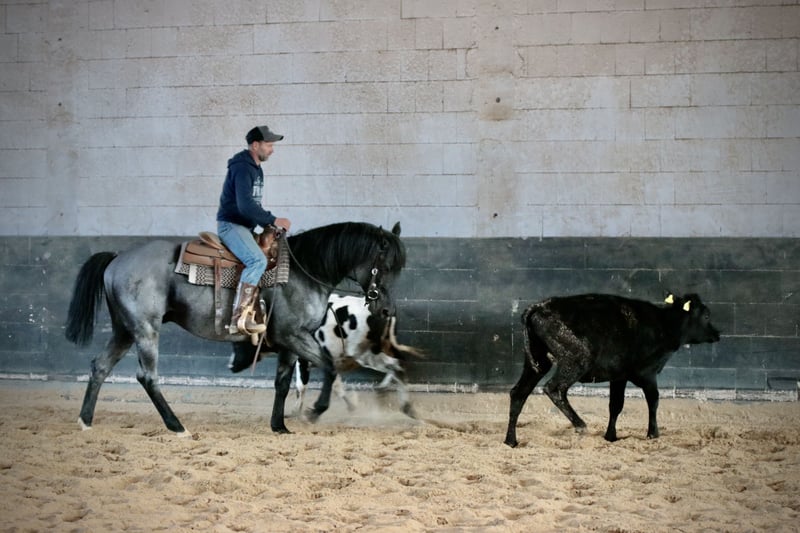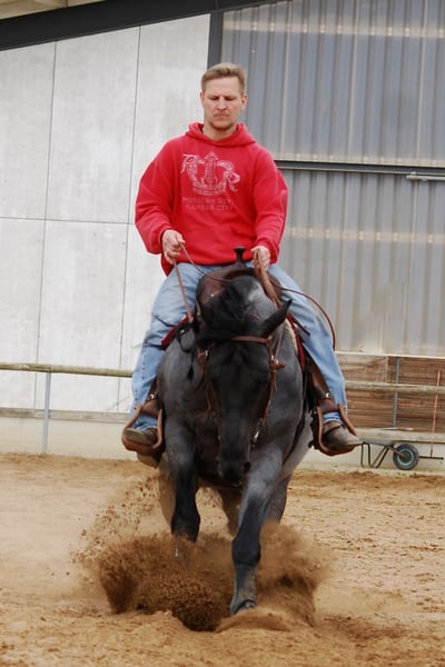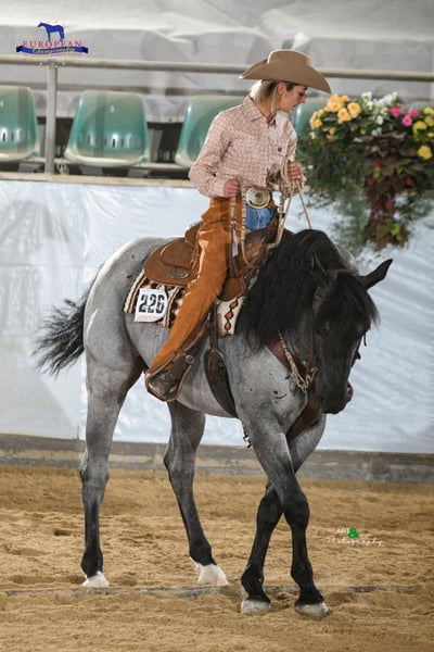 YOU AIN´T RIDING UNTIL YOU´RE RIDE A HANCOCK .... das ist ein offenes Geheimnis unter den US-Ranchern. In den USA werden sie gezüchtet für die "every day ranch work" und für Wettkämpfe wie Team Roping und Ranch Versatility. In Europa äußerst seltene Blutlinie, die für Ausdauer, Robustheit, Nervenstärke, extrem starke Knochen und harte Hufe steht. Unser MJM Saltys Blue Ezra ist ein würdiger Vertreter dieser Blutlinie. Wir haben ihn aus den USA importiert, um diese ursprünglichen Eigenschaften eines Quarters auch im deutschsprachigen Raum wieder verfügbar zu machen. Wie die bisherige Nachzucht zeigt, eignet er sich auch hervorragend zur Stärkung des Fundaments und der Nerven von Performance gezogenen Quarter-STuten ;-) . Sein STockmaß beträgt 156 cm, er ist homozygot für Black und für Roan. Selbstverständlich ist er Five Panel n/n, sowie MYH1 n/n und OLWS n/N Ezra ist erfolgreich geshowt in der Ranch Riding, u.a. erfolgreich im Finale der AQHA European Championship Open in Kreuth. Bedeckung durch Frisch-, Kühl-, und Gefriersamen. Decktaxe: 950,00 Euro + 100 Euro Nebenkosten der Deckstation pro Samenbestelltung + ca. 35 Euro Versand (Versandpreis gilt nur für Kühlsamen und innerhalb Deutschlands! Nebenkosten für europischen Versand bitte persönlich erfragen! ). Frühbucherpreis bis Ende Oktober: 800,00 Euro Frühbucherpreis bis Ende Dezember: 850,00 Euro Weitere Infos auf unserer Webseite oder bei FB unter seinem Namen.