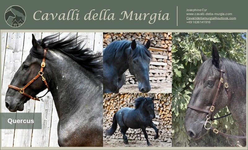 -Quercus- Quercus is a 2020-born Murgesen gelding currently in training. He is already familiar with saddle and bridle and carries rider’s weight at the walk. With a height of 15.8 hh and a solid build, he often appears larger than he actually is. His impressive posture further accentuates this impression. Temperamentally, Quercus is an alert and curious type with a noticeable forward energy. He doesn’t always take life too seriously and, with his humorous nature, often surprises with a playful attitude. At the same time, he possesses excellent balance, making him a promising partner for the future. With a knowledgeable and patient rider, Quercus will develop into a willing, expressive, and striking riding horse – a true eye-catcher for enthusiasts of exceptional horses. He is currently in a paddock with his friends Pensiero and Fiammingo. Has Quercus caught your interest and would you like to meet him in person? He is currently in his home region in Apulia – we are happy to assist you in planning a visit there. We also gladly handle the purchase process, including contract formalities, transportation to Germany, and a pre-purchase veterinary exam. X-ray images are available and can be viewed upon request. More pictures and videos available upon request. We look forward to hearing from you! www.cavalli-della-murgia.com