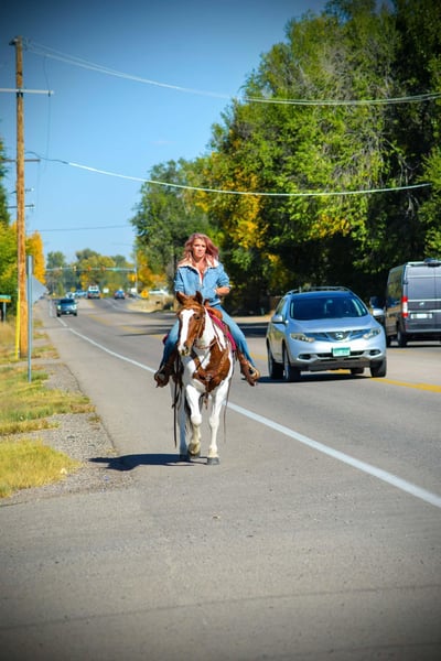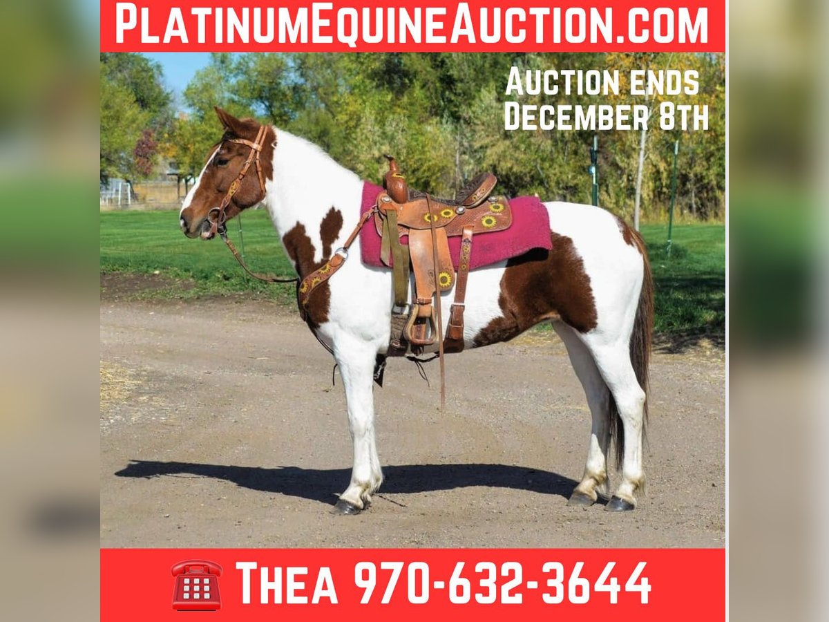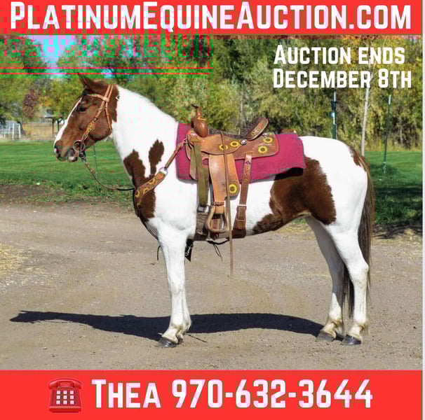 ONLINE AUCTION Place your bids at www.PlatinumEquineAuction.com Starting Bid $3500 Auction ends December 8th, 2024 Need a new saddle? Check out White Rock Saddles on our website or Facebook! Haven is a 10 year old (extremely eye catching) mustang paint mare! This mare is intelligent, athletic and EXTREMELY smart. This mare LOVES her job, she could work all day and still be having fun at the end of the day! She has been used for packing up into the mountains, hauling meat out and even seeing wild horses! She is great with steep terrain, knows how to use her hind end and if you drop your reins she’ll pick her way through rough territory! She has been in town as well, crossing bridges, around traffic (even with little kids on her) and around strollers,bikes and even a drive thru! She is fun! She has all the go and endurance you could ask for while being trustworthy, with a good brain. Haven has incredible feet and has been barefoot her whole life! We have carried flags on her, thrown tarps over and under her and messed around with trail obstacles, she is not hesitant to play with anything. Haven has a great collection and frame up, a smooth stop and rollback, flying lead changes, cross overs and is working on a finished neck rein. She is as handy in the arena as out with all of her desensitization, haven can still be untrusting on the ground. She loves having one owner and really needs a person that will spend time and bond with her Haven has been around the barrel pattern , is learning the poles and has even been roped off of making her a great all around mare for someone wanting to go any direction. This is a super fun mare (not to mention stunning) with a huge personality and a ton of brains. Don’t miss out!! Located in Fort Collins, CO. Contact Dynamite Horses Thea 970-632-3644 with any questions. ONLINE AUCTION Place your bids at www.PlatinumEquineAuction.com Starting Bid $3500 Auction ends December 8th, 2024 Need a new saddle? Check out White Rock Saddles on our website or Facebook!