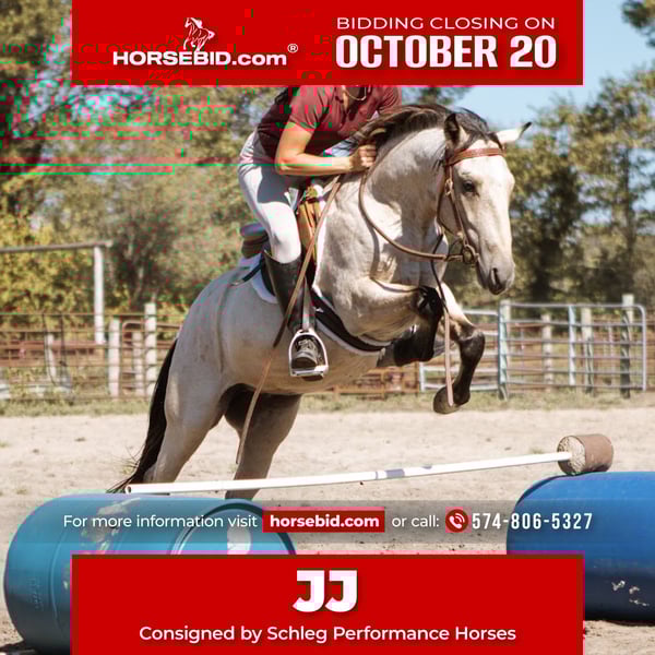 ♦️ 𝐭𝐡𝐞 𝐀𝐌𝐄𝐑𝐈𝐂𝐀𝐍 𝓕𝓪𝓵𝓵 𝓒𝓵𝓪𝓼𝓼𝓲𝓬 ♦️ Happening now thru MONDAY | OCTOBER 20th - Available EXCLUSIVELY on HorseBid's website! For more details and to register visit: www.Horsebid.com CONSIGNOR CONTACT: Schleg Performance Horses 574-806-5327 LOCATION: North Judson, IN BREED: Mustang REGISTERED: No COLOR: Buckskin HEIGHT: 13.2 AGE: 3 GENDER: Gelding JJ is a true Mustang from the west, but don’t let that get in the way of seeing all his amazing talent. He stands 13.2 and is packed full of talent. From his incredible stop to jumping and roping, JJ has been ready and willing to please in anything we have asked him to do. JJ is a very athletic mover, light on his feet and smooth in all gaits. We have used him all over on the farm and taken him to town to see the sights. JJ has been hauled here and there to practice roping pens and rodeos and handles all the commotion and chaos like a champ. He is light in your hands and on your leg, giving to the bridle and easily moves shoulders, hips and side passes. Out on the trail JJ has crossed rivers and streams, tread through the mud, climbed up and down hills and crossed over logs. He is easy going whether he’s in the front of a group, in the middle or brining up the rear.JJ loads great and hauls well. He has been hauled to several over night camping trips and stands quiet at the hitching rail. We have rode JJ many miles in both English and western tack. Here at the farm, JJ lives out on a lot with a couple other horses. He is not a bully to other horses but also not on the bottom of the pecking order. He is a super easy keeper and requires no maintenance. He is easy to catch outside and when stalled, JJ is very mannerly and easy going. In and out of the arena JJ has easy gaits, smooth transitions and he guides well on a neck rein. JJ has been my go to ride most of this year, and I’m sure that once you swing a leg over him you’ll understand why.
