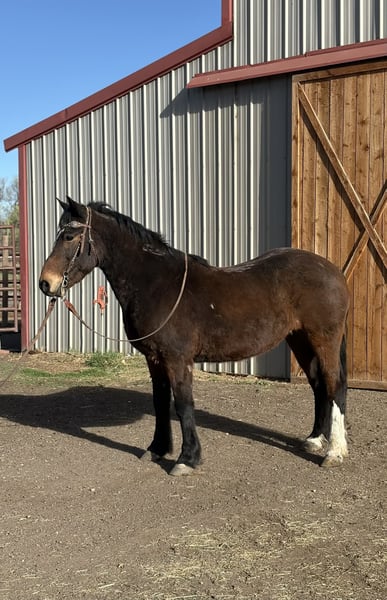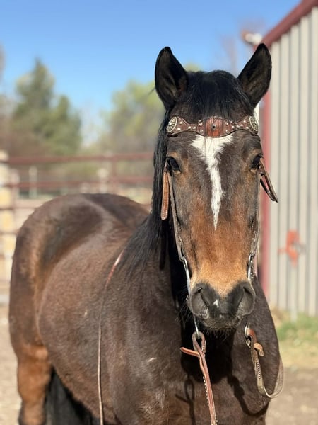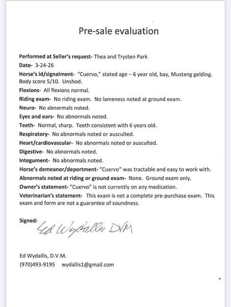 "AVAILABLE ON ONLINE HORSE AUCTION AT www DOT PlatinumEquineAuction DOT com BIDDING OPEN NOW thru SUNDAY | MAY 3RD! *Final price will be determined on auction site* CONSIGNOR CONTACT INFO: Thea Park 970-632-3644 LOCATION: Fort Collins, CO Cuervo is a 6-year-old bay mustang gelding standing at 14.1 hands, with a stocky build and eye-catching chrome markings that add to his charm. He’s got a bit of a nervous streak on the ground—he’s easily spooked of people on the ground and needs a calm, experienced handler who can approach him gently and confidently, because he might act like he’s seen a ghost every time you open his stall door. But once you’re in the saddle, Cuervo shines like a star. He’s incredibly smart, quick, and athletic—one of those rare horses that can really wow you with his skills. He’s free lunged over fences as high as 4’6” with ease, showing impressive power and grace. His agility is off the charts; he can spin tight circles that dig into the dirt, sidepass smoothly at all gaits (walk, jog, and lope), and turn faster on the rail than many cutters you’ll see out there. Cuervo can also perform six flying lead changes straight down the center line and stop instantly on command. On top of all that, he’s got a finished neck rein and responds beautifully to leg cues, making him a true pleasure to ride. He’s also seasoned on the trail, unfazed by bikes, runners, and even the chaos of downtown traffic. Bridges, lakes, rivers, tunnels—you name it, Cuervo’s crossed or gone through it without hesitation. The only real challenge with Cuervo is his nervousness on the ground, but if that wasn’t a factor, he’d be perfect even for the smallest riders, the more we work with him the better he gets and we truly believe with a forever person he will learn confidence on the ground as well. He’s genuinely a cool horse to ride and would be #1 on my list to keep if I had an extra spot for a personal horse. Come check him out and feel free to watch his video or get in touch with any further questions! For more information contact Thea at 970-632-3644.