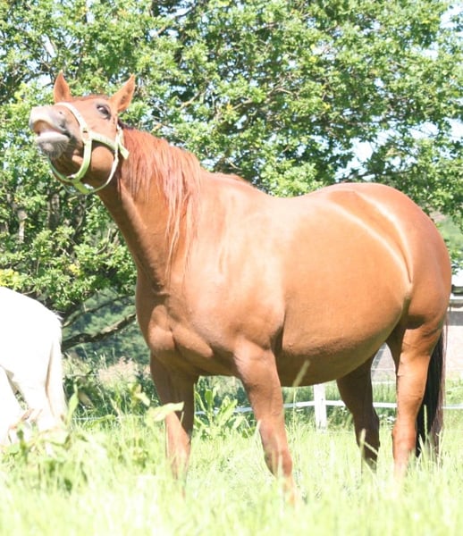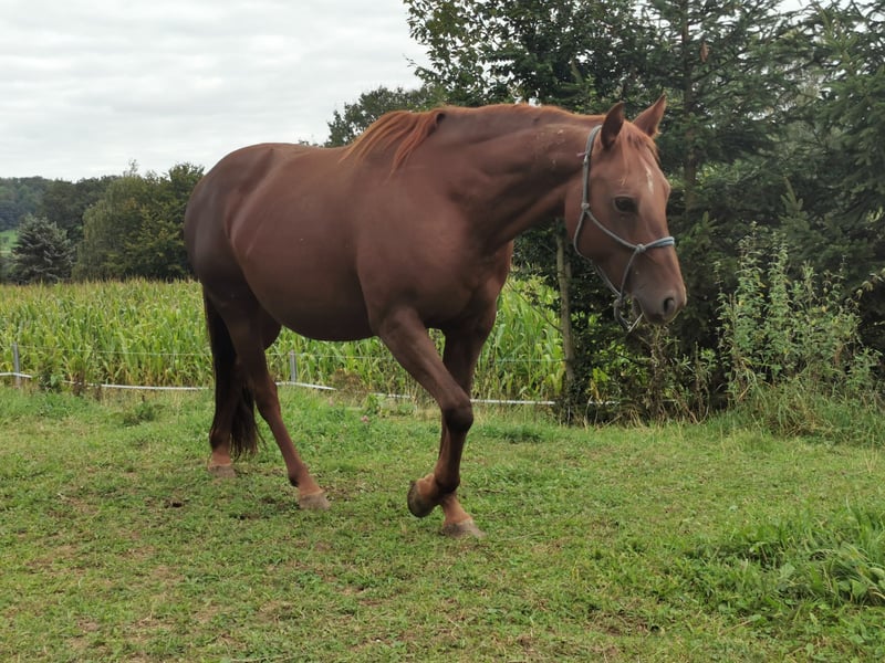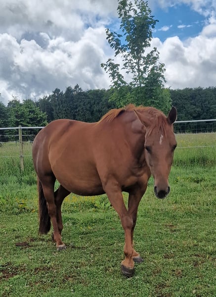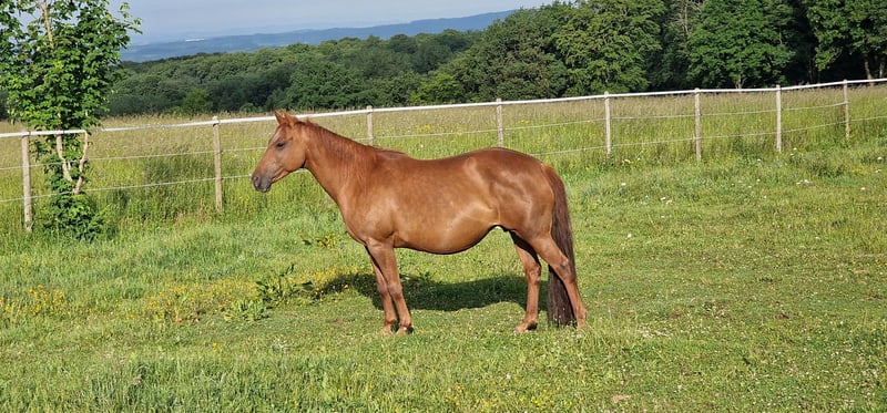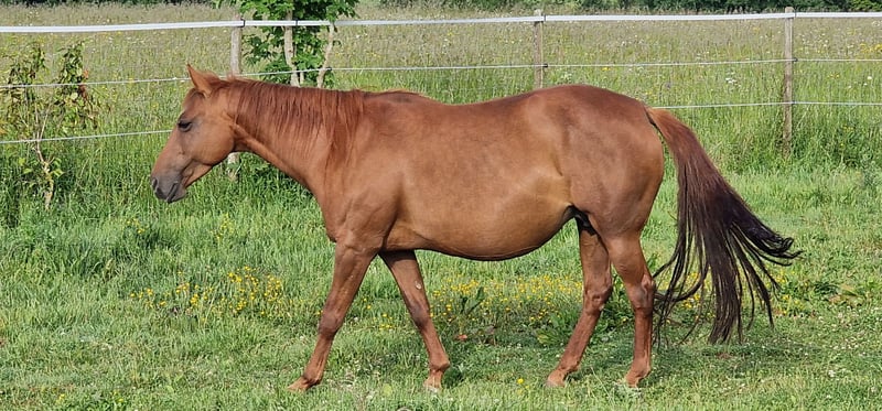 Dixie-Achor vom 26.05.2013 eine Traum in Chestnut. Gut Bemuskelt mit Starkem Fundament und großen Hufen. Am 29.06.2025 hat sie ein wunderschönes Fohlen bekommen. Ihre Nachkommen sind groß und kompakt. Alle über 153 cm mit viel Mähne. Achor, gibt schöne Bewegungen mit guter Balance weiter. Ihr liebes und respektvolles Wesen erben die Nachkommen. Sie suchen eine Unscheinbare, souveräne und erfahrene Stute, dann ist sie die Richtige. Sie ist eine Rarität, da sie noch aus zwei Ursprünglichen besteht. Sie ist gedeckt von Ian-Inferno, unserem goldbuckskin Tobiano.