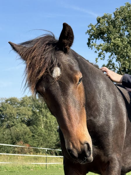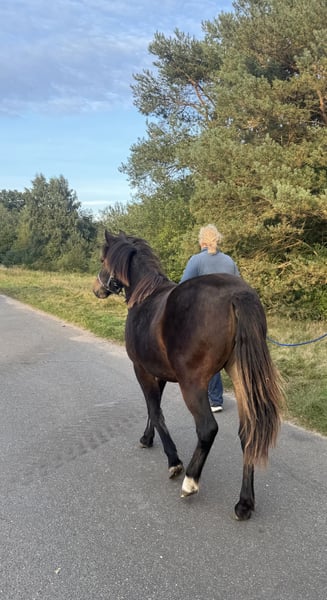 Unsere wunderhübsche Stute "Toffifee" sucht leider aufgrund geänderter Lebensumstände ein wirklich tolles neues zu Hause bei pferdeerfahrenen Menschen. Toffi hat eine New Forest Pony Mama und einen Highland Pony Papa. Ihr Endmaß wird um die 1,40m werden, was auch super einen kleineren Erwachsenen abdeckt. Sie ist ein kleiner Rohdiamant, der nun gern geschliffen werden möchte. So ist sie nun mit ihren 1,5 Jahren schon ein richtig großes Mädchen geworden, was sehr gern etwas mit ihrem Menschen machen möchte. Sie ist ein kleiner Kasper, der gern um die Aufmerksamkeit buhlt.So stellt sie sich bei uns auf dem Paddock gern mal in die Badewanne, so dass man höher über den Zaun schauen kann, um nach ihrem Menschen Ausschau zu halten. Sie möchte einfach so gern auch mal dran sein. Hufe geben, geputzt werden, den Trailplatz erkunden oder mal mit auf einen Spaziergang in der Gruppe kommen, kennt Toffifee bereits. Der Hufschmied ist zum Ausschneiden auch alle 7 Wochen da und den Tierarzt kennt sie eigentlich nur zum Impfen. Sie ist bei Fremden erst ein wenig skeptisch, vertraut dafür ihrem Menschen voll und ganz. Manchmal kann sie auch ihren Ponydickkopf zeigen, z.B. wenn man auf die Pferdewaage oder in den Hänger steigen soll... da muss man dran bleiben und einfach den längeren Geduldsfaden zeigen, dass klappt auch das ganz artig. Toffi hat eine Fohlenprämie mit der Wertnote 7,3 erhalten. Sie ist als kleines deutsches Pony eingetragen worden. Aufgrund ihres sanftmütigen Charakters und des hübschen Exterieurs ist sie sicherlich auch zur Zucht gut einsetzbar. Bei uns ist sie behütet in einer gemischten Herde groß geworden, kennt sowohl Mini-Ponys als auch Großpferde und ist allerbestens sozialisiert und immer nett in der Herde. Zudem ist sie natürlich E-Zaun Sicher, geimpft, entwurmt und bringt ihren Pass mit Abstammungsnachweis mit.