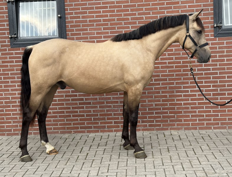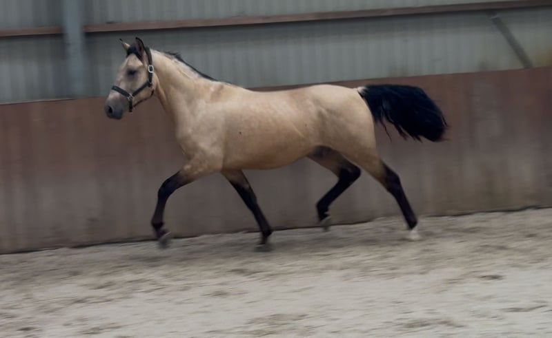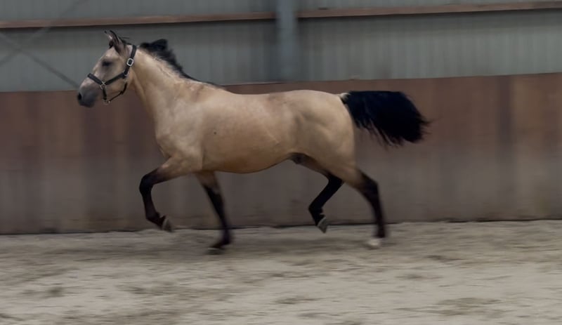 Tribunolas is a very beautiful specimen. Not only because of his lovely color, but also due to his appealing type and appearance. He currently stands at a height of 1.53m. He possesses three good basic gaits. He moves with great suppleness and good leg technique. He can also naturally change leads easily. His first free jumps are promising. He shows a lot of athletic ability. He jumps with quick reflexes and good technique, consistently finishing well behind the jump. He was castrated about 6 weeks ago. Tribunolas has not yet been backed. However, he is honest in handling and has a curious and level-headed character. Please call or message if interested. A video is available. Phone: +31(0)643197337