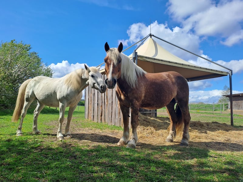 Schweren Herzens suchen wir ein neues Zuhause für unsere 14-jährige Norikerstute "Fanni". Das Pferd wird nur an eine Privatperson mit Zeit abgegeben, bevorzugt werden Personen, die Erfahrungen mit Kaltblütern und ggf. mit Hufkrebs haben. Wir haben Fanni im Oktober 2024 als Reit- und Kutschpferd gekauft. Im Frühling 2025 wurde bei ihr Hufkrebs an zwei sowie Strahlfäule an den anderen zwei Hufen diagnostiziert. Drei Hufe sind bereits erfolgreich ausgeheilt. Dies gelang uns, da wir sie unter optimalen Bedingungen dafür (trocken und sauber mit sandigem Boden) halten konnten. Sie steht seit November 2025 in unserer Reithalle. Aktuell wird der weiterhin kranke Huf wie folgt behandelt: Dreimal die Woche erfolgt eine Wundreinigung unter oraler Sedierung und alle 4-6 Wochen eine Hufbearbeitung durch den Hufschmied begleitet durch die Tierärztin. Die Sedierung ist nötig geworden, da Fanni aufgrund der Schmerzen die Hufe derzeit nicht mehr bereitwillig und ohne Gegenwehr gibt. Da wir eine Jugendhilfeeinrichtung mit tiergestütztem Konzept sind, kommen wir aufgrund der derzeitigen personellen Lage mit der Behandlung an unsere Grenzen und hoffen einen Ort für Fanni zu finden, an dem sie weiter behandelt werden kann. Fanni ist nämlich ein sehr menschenbezogenes, zutrauliches, freundliches und auch ein sehr schönes Pferd. Bei ihren Vorbesitzern wurde Fanni als Zuchtstute gehalten (reinrassig mit Stammbaum und 2 Fohlen) sowie ein- und zweispännig gefahren. Bei uns wurde sie im Gelände geritten, da sie sich in der Halle antriebsarm zeigte. Im Gelände erlebte wir sie als angenehm reitbar und sehr sitzbequem. Zu erwähnen ist noch, dass Fanni beim Vorbesitzer in einer gemischten Kaltblutherde stand. Bei dem Versuch, sie in unsere Warmblutherde zu integrieren, zeigte sich Fanni als zu dominant, sodass uns eine Integration als zu risikoreich erschien. Auch aufgrund dieser unzureichenden Haltungsbedingungen ist ein Besitzer- und Herdenwechsel notwendig. Wegen der Hufkrebserkrankung ist wichtig, dass Fanni auch bei vollständiger Ausheilung nicht dauerhaft in einer Box und Strohuntergrund gehalten wird. Optimal ist eine Offenstallhaltung mit trockenem und sandigem Boden. Im Sommer stand sie bei uns dauerhaft auf der Weide mit Sichtkontakt zu den anderen Pferden.