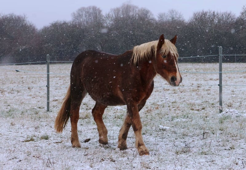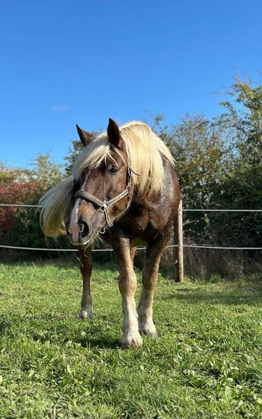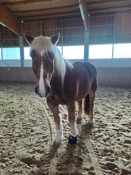 With a heavy heart, we are seeking a new home for our 14-year-old Noriker mare, "Fanni." The horse will only be entrusted to a private individual who has the time and experience, preferably with draft horses and possibly with laminitis. We purchased Fanni in October 2024 as a riding and carriage horse. In spring 2025, she was diagnosed with laminitis in two hooves and white line disease in the other two. Three hooves have already healed successfully, thanks to optimal conditions (dry, clean, sandy ground) in which she has been kept. Since November 2025, she has been housed in our riding hall. Currently, her remaining affected hoof is treated as follows: wound cleaning three times a week under oral sedation, with hoof trimming every 4-6 weeks by the farrier, accompanied by the veterinarian. The sedation has become necessary because Fanni, due to pain, is no longer willing or able to give her hooves willingly and without resistance. As we are a youth welfare organization with a horse-assisted concept, we are reaching our limits with her ongoing treatment due to current staffing constraints and hope to find a place where she can continue to receive proper care. Fanni is a very people-oriented, trusting, friendly, and also a very beautiful horse. Her previous owners kept Fanni as a breeding mare (purebred with pedigree and two foals) and she was driven single- and double-pony. With us, she has been ridden in the field, as she showed little enthusiasm in the indoor arena. In the terrain, we found her to be pleasant to ride and very comfortable in the saddle. It is also worth mentioning that Fanni was kept in a mixed draft horse herd with her previous owner. When we attempted to integrate her into our warmblood herd, she proved to be too dominant, making us consider her integration too risky. Due to these inadequate housing conditions, a change of owner and herd is necessary. Because of her laminitis, it is important that Fanni, even after full recovery, is not kept permanently in a box or on straw bedding. Ideally, she should be kept in an open stable with dry, sandy ground. During the summer, she was permanently on pasture with visual contact with the other horses.