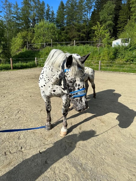 Beautiful tiger mare by Jumbo Elmar out of Linnea, born March 7th, 2021. She has foaled once so far and is currently in foal to a different stallion. Well-behaved in handling, she has no issues with the farrier or loading onto the trailer. She is still untrained but can be further trained upon request for an additional fee. No known health issues, and she lives in a herd with a relatively low ranking. Transport can be arranged at the buyer's expense. A very attractive mare suitable for various disciplines. She is registered in the main studbook with a WN of 7.59 as a broodmare. Please feel free to contact us if interested.