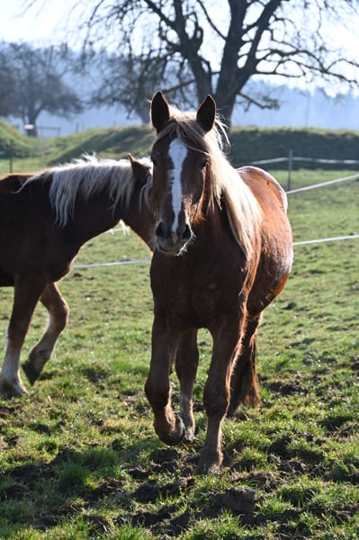 This beautiful, majestic dark-fawn Noriker mare is looking for her person. Larissa was born on February 5th, 2023, and will be three years old. She is expected to reach approximately 16.1 to 16.3 hh. Larissa is confident, friendly, and well-versed in the basics of young horse training. She enjoys grooming and remains calm and relaxed during the process. Like all my horses, Larissa is familiar with children, cats, cattle, alpacas, farm machinery, cars, and dogs. She spent her first summer on the alpine pasture with her mother and lives here in a species-appropriate group environment, having been outside during the summers. Larissa has a very beautiful, expressive trot with good ground coverage. She is regularly dewormed, chipped, and registered. Larissa has a full pedigree and is of great interest for breeding programs. Sire: Balisto Nero Dam: Engelbert Vulkan