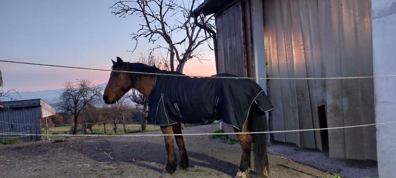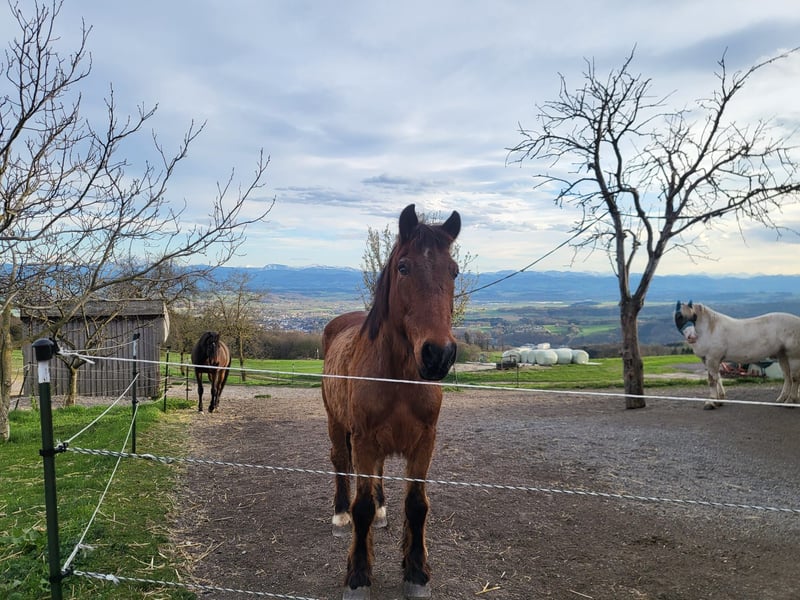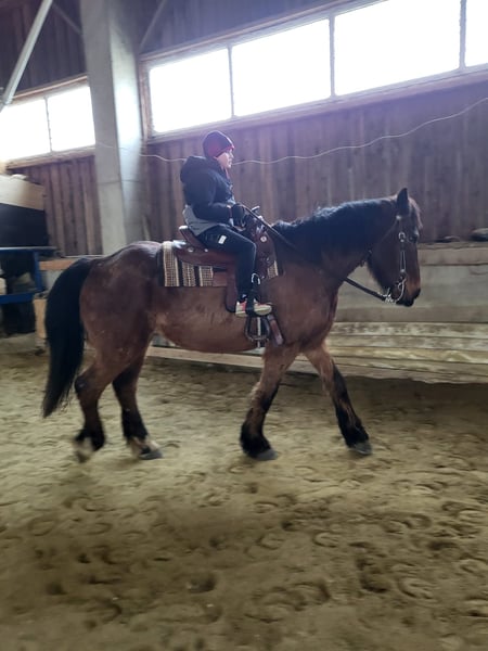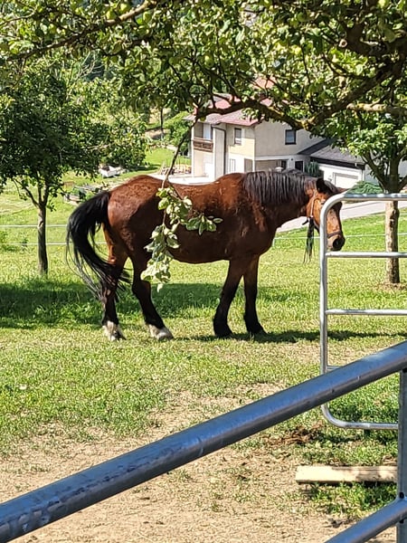 Baro, a loyal 27-year-old Noriker mix with a height of 16.8 hh. A very gentle gelding, easy to handle, shoe- and loading-friendly. Former carriage horse, currently ridden in Western leisure riding. Due to a change in hobby pursuits, he is being sold with full horse equipment (saddle, saddle pads, bridle, blankets, halter, grooming supplies, etc...).