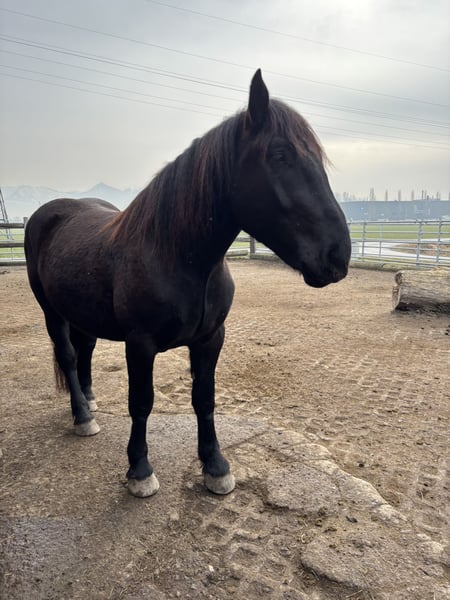 Beautiful 4.5-year-old Noriker, dark bay. Well-started under saddle, currently in training. Calm, very people-oriented but not suitable for beginners. He requires a strong rider and a confident yet fair hand. Stands quietly for grooming, tacking, and hoof care. He is trained in all three basic gaits. Exhibits smooth, flowing movements and good impulsion. Only available to experienced riders. Priority over price!