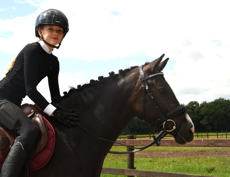 Queen Badu is een zeer lieve 3-jarige D-dressuurpony. Haar vader is Tackmann’s Candyman (zie foto 6), een hengst die jaren op internationaal niveau in de wedstrijdsport heeft gelopen. Zijn vader is Champion de Luxe. Haar moeder is Chakira du Bois (zie foto 7), een hele lieve merrie van Don Cremello du Bois. Queen Badu is lief in de omgang en braaf tijdens het rijden. Ze is een echte knuffel! Ze heeft geen stalgebreken of ongewenst gedrag. Ze is vanaf veulen bij ons opgegroeid en bij ons zadelmak gemaakt. Ze is altijd ingeënt, ontwormd en bij de tandarts geweest. Voor meer informatie graag alleen contact via 06-42652300.