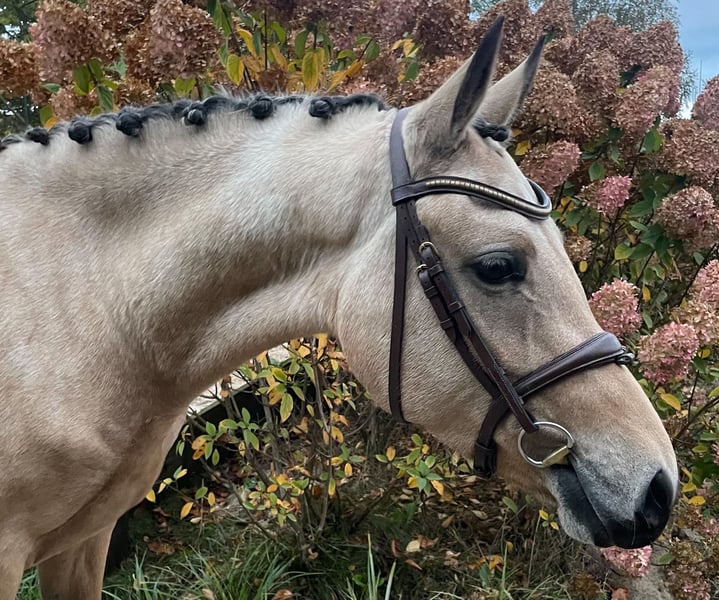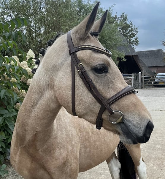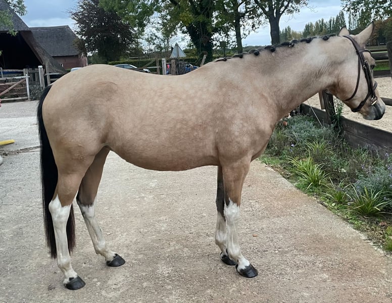 Caeldori EYE-CATCHER Für alle, die auf der Suche nach etwas Besonderem sind: eine 3,5-jährige NRPS D-Pony-Stute: - Stute - ca. 1,46 m groß - v. Leuns Velds Winston Jr. - Falbont mit viel Weiß, ein echter Blickfang!!! Caeldori ist ein äußerst liebevolles und hübsches Pony mit großem Potenzial für den Sport und die Zucht. Sie verfügt über drei gute und korrekte Grundgangarten. Als Fohlen erreichte sie bereits den ersten Platz und die erste Prämie bei der Fohlenschau! Sie ist sattelfest und nimmt die Arbeit sehr gut, schnell und brav auf! Außerdem hat sie schon einmal einen Sprung unter dem Sattel gemacht, was sie sehr gut gemeistert hat! Auch im Wald und an der Straße ist sie brav. Beim Satteln hat sie keinen Fehler gemacht. Natürlich ist sie noch jung und etwas grün, daher noch nicht für den Anfänger geeignet, aber mit der richtigen Betreuung und Training denke ich, dass sie dafür letztlich geeignet sein könnte! Sie steht uns nicht im Weg und wir werden sie behutsam weiter ausbilden, aber sie darf auch zu jemandem ziehen, der mit einer jungen Pony weiter wachsen möchte! Sie ist frei von (Haltungs-)Mängeln und zeigt sich brav beim Transport, beim Schmied etc. Sie wurde noch nie geröntgt, natürlich gegen Kosten des Käufers. Videos sind vorhanden, bitte bei Interesse selbst per WhatsApp oder Nachricht anfragen! Bei Interesse gerne eine Nachricht oder einen Anruf/WhatsApp an +31612090029. Bitte nach 17:00 Uhr anrufen.