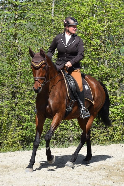 Soe geht auf den bekannten Zuchthengst Peron M zurück, der ein Enkel des weltbekannten Donnerhall ist. Über ihre irische Mutter ist englisches Vollblut in ihren Genen. Soe besticht durch ihre Schönheit und lässt sich sehr fein reiten - sehr fleißig im Schritt und ein Galopp, bei dem man wie auf Wolken schwebt. Auch im Trab bringst sie ausrechend Vermögen mit. Sie ist ausgebildet in Working Equitation Klasse L, Fliegende Wechsel fallen ihr leicht. Weiters wurde Soe auch Vielseitigkeit gestartet. Sie ist absolut verkehrssicher und war auf mehreren Wanderritten, geht auch problemlos alleine ins Gelände, wo man sie am durchhängenden Zügel reiten kann, auch im Galopp in allen Geschwindigkeiten. Beherrscht alle Seitengänge in allen Gangarten. Soe ist sehr gut erzogen, lässt sich problemlos verladen und ist brav beim Schmied. Sie steht aktuell in einer gemischten Herde mit 10 weiteren Pferden im Offenstall und kommt gut mit anderen Pferden aus. Gelegentlich wird sie von geschickten Reitschülern im Unterricht geritten. Der einzige Grund, warum ich sie hergebe, ist, dass sie auf Turnieren gelegentlich unleidig wird, besonders, wenn ein weiteres Pferd aus ihrer Herde mit ist. Da ich selbst gerne Working Equitation Turniere reite, sowie VS, entspricht sie leider nicht meinen Wünschen. Soe ist kein Anfängerpferd, mit mangelnder Balance und unruhiger Hand kann sie keinen guten Job machen. Sie wird nur an einen sicheren, eher mutigen Reiter abgegeben. Ich könnte sie mir auch gut in der Zucht von Vielseitigkeitspferden vorstellen!