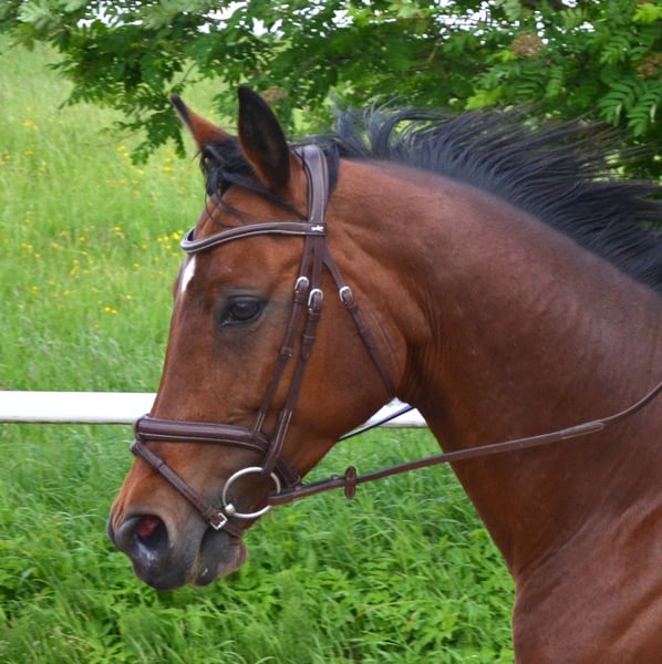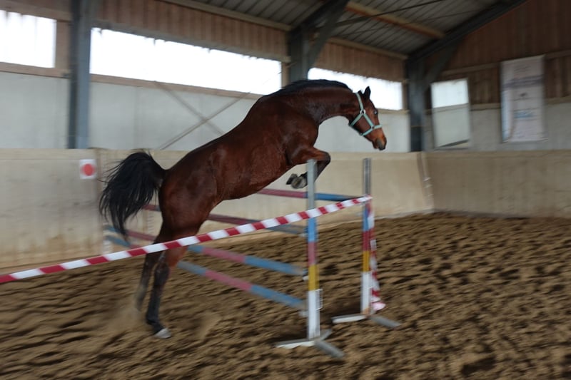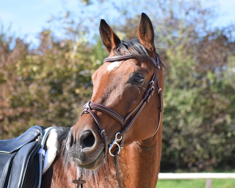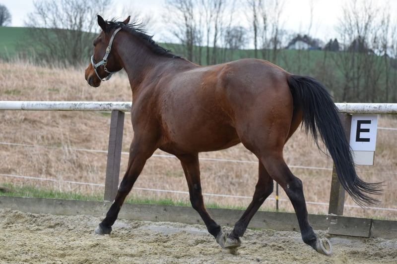 Soe descends from the well-known breeding stallion Peron M, who is a grandson of the world-famous Donnerhall. Through her Irish mother, she has Thoroughbred blood in her genes. Soe captivates with her beauty and is very pleasant to ride - she is very diligent in the walk and has a gallop that feels like floating on clouds. She also possesses sufficient ability in the trot. She is trained in Working Equitation Class L, and flying changes come easily to her. Furthermore, Soe has also competed in eventing. She is absolutely traffic-safe and has been on several trail rides, going out alone into the terrain without any problems, where she can be ridden on a loose rein, even in a gallop at all speeds. She masters all lateral movements in all gaits. Soe is very well-mannered, loads easily, and is good with the farrier. She is currently in a mixed herd with 10 other horses in an open stable and gets along well with other horses. Occasionally, she is ridden by skilled riding students in lessons. The only reason I am parting with her is that she occasionally becomes unruly at competitions, especially when another horse from her herd is present. Since I enjoy competing in Working Equitation as well as eventing, she unfortunately does not meet my needs. Soe is not a beginner's horse; without proper balance and a calm hand, she cannot perform well. She will only be sold to a confident, rather bold rider. I could also see her doing well in breeding eventing horses!