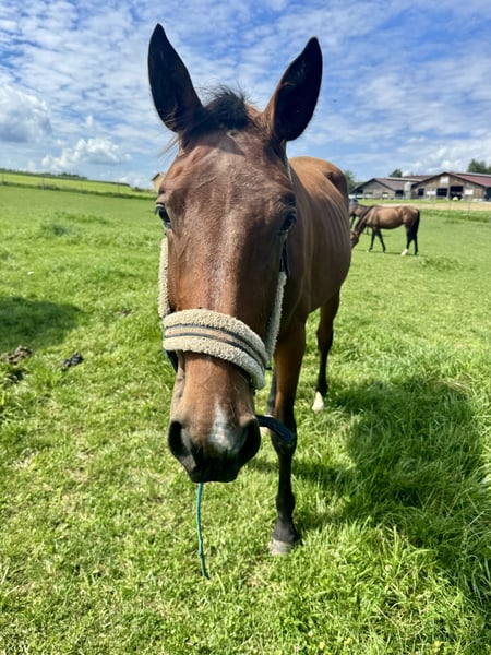 Entzückende Maus zu vergeben in gute Hände da ich umschwänken möchte auf PoloPferde. Sie ist in einer Aufzucht wo sie voll und ganz ihre Zeit genießen kann und mehr oder weniger unberührt ist . Sie kennt aber Schmid , gobt die Beine brav, lässt sich führen , anbinden , putzen und ist super entspannt vom Gemüt . Eine ganz süße Maus . Schlägt nicht , beißt nicht öegt die ohre nicht zurück und lässt alles soweit mit sich machen ohne Drama . Sie hat eine Überbiss der sie soweit nocht wirklich einschränkt . Nur regelmäßig Zähne abschleifen wäre wichtig , aus Heunetz fressen könnte schwieriger für sie sein und ganz ganz kurze Gras . Sonst ist sie ein ganz normales Pferd .