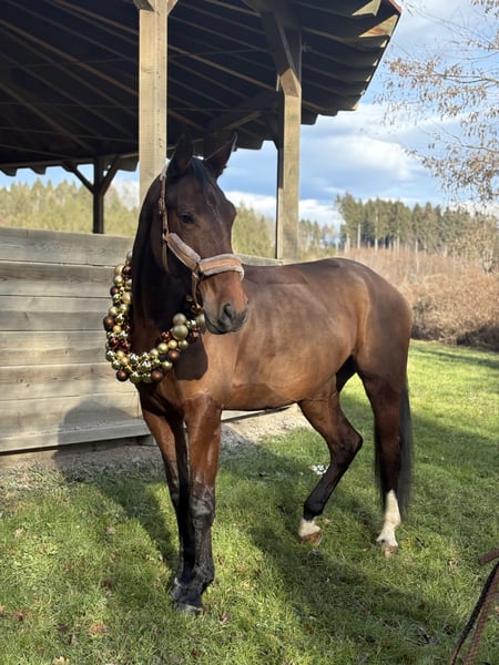 Beautiful, well-behaved mare with competition experience seeks new home For sale is a loving and extremely well-behaved 5-year-old mare with a height of approximately 1.72 m. I have owned her since she was three years old and have trained her myself with a lot of time, patience, and love. She is a real treasure in daily handling – absolutely uncomplicated, people-oriented, and friendly. Even under saddle, she consistently shows reliability, willingness to perform, and no vices, making her well-suited for less experienced riders. She has already been successfully presented in eventing. It is particularly important to me to find a loving and supportive home for her. If you are seriously interested, I look forward to a message and am happy to answer any further questions.