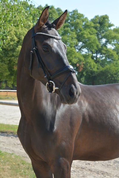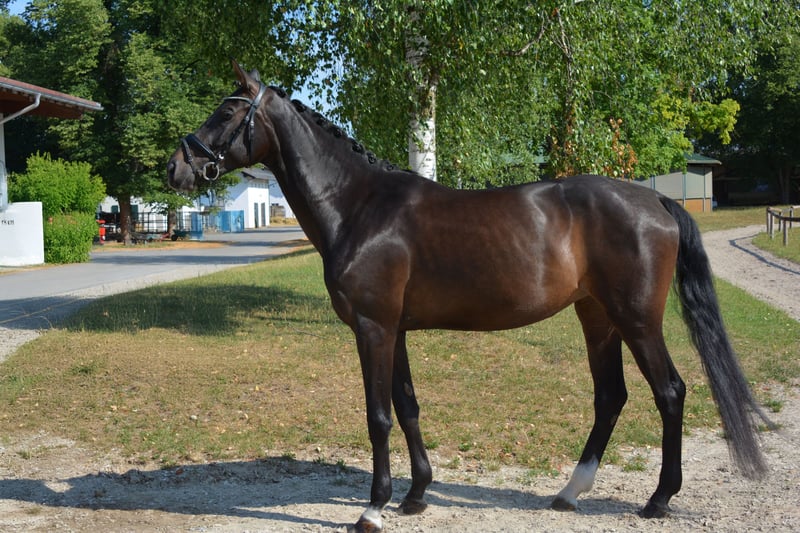 This stylish black mare is under saddle and can be ridden freely in all three basic gaits. Hope is a sensitive mare who needs a fine and skilled rider who can provide her with the necessary security and trust without applying too much pressure. With further training, she has a lot of potential for the dressage arena. She is sweet and people-oriented, making it enjoyable to work with her every day. Get to know Hope and come to the Riemer Pferdemontag on July 14, 2025!