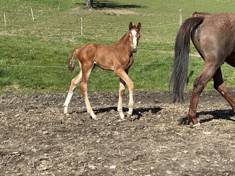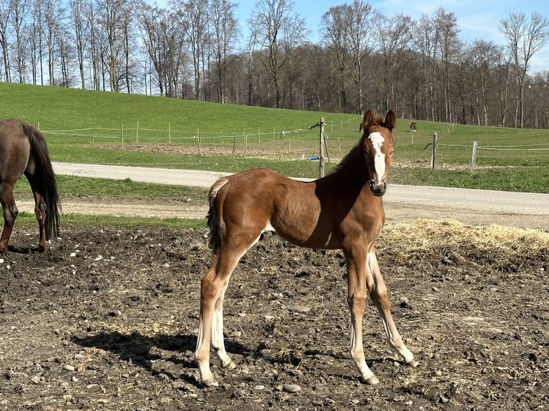 Jumping cracker directly from the breeder: This is a colt of exceptional quality, the likes of which are very rare to find. This young man is absolutely head-clear and very correct, standing beautifully in stallion type with lots of rubber and movement. With a great uphill canter, knee action and lots of expression, he is already very promising at his young age. His sire is none other than Tangelo van de Zuuthoeve - a living legend about whom nothing more needs to be said. With dozens of licensed stallions and Grand Prix horses, he is also known for his clear-headed, uncomplicated offspring. His dam competed up to the age of 6 and was placed up to medium level under amateur riders. Her pedigree Eurocommerce Singapore x Zichem leaves nothing to be desired. Accordingly, she stood out at shows with her high quality and was able to secure placings and victories. She is beautiful and exceptionally rideable with very good gaits and a lot of uphill tendency and collection. This is the only reason why we dared to use such an expensive semen and were more than rewarded. Date of birth 21.2.24 (almost 4 weeks old in the pictures) Gladly to supporting hands or stallion breeders !