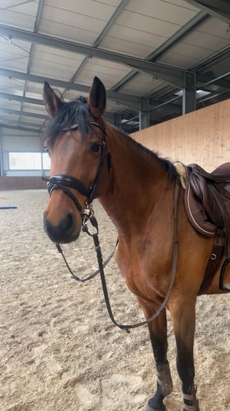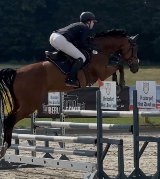 Schweren Herzens biete ich meine 8-jährige Stute Chacoona Blue zum Verkauf an, da ich ihr aufgrund veränderter Lebensumstände zeitlich nicht mehr gerecht werden kann. "Corona" ist eine sportlich aufgemachte, leistungsbereite Stute mit sehr ehrlichem und kooperativen Charakter. Sie ist dem Reiter sehr zugewandt, möchte gefallen und zeigt sich auch unter Leistungsanforderung immer fair und klar im Kopf. Im täglichen Umgang ist sie unkompliziert, freundlich und absolut brav. Unarten wie Steigen oder Bocken sind ihr fremd. Ich habe sie 4-jährig gekauft und dann weiter erfolgreich bis zur Klasse L im Springsport vorgestellt. In der Klasse A gewann sie mit einer Wertnote von 8,3 und war darüber hinaus mehrfach mit Noten im 8er-Bereich platziert. Sie springt mit viel Vermögen, Übersicht und Vorsicht. Am Sprung möchte sie stets "auf die andere Seite" und zeigt dabei Mut sowie eine sehr positive Einstellung zur Arbeit. Corona bringt deutliches Go mit. Sie ist sehr gehfreudig und leistungsbereit, weshalb sie regelmäßig gearbeitet werden möchte. Aufgrund dessen verkaufe ich sie nicht als reines Anfängerpferd, sondern an jemanden, der ihr Potential weiterentwickeln kann. Ins Gelände geht sie sowohl alleine als auch in der Gruppe, zeigt sich dabei unerschrocken und kennt auch Verkehr und größere Maschinen. Sie ist schmiedefromm (derzeit vorne beschlagen) und bisher noch nie lahm oder gesundheitlich auffällig gewesen. Aufgrund ihrer Abstammung ist sie zudem auch für die Zucht interessant. Bei ernsthaften Interesse oder weiteren Fragen freue ich mich über eine Nachricht.