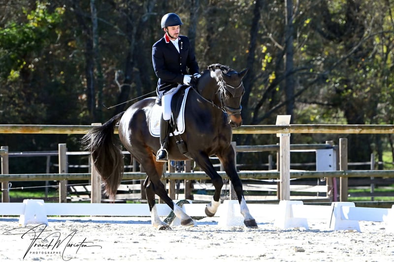 Nous vous présentons Sunny, un superbe hongre Oldenbourg de 13 ans, mesurant 1m75, alliant puissance, confort et élégance. Sous sa belle allure de cheval moderne se cache un partenaire généreux, curieux et profondément gentil, qui a déjà prouvé sa fiabilité sur les carrés de dressage.Issu de lignées allemandes réputées, Sunny hérite de la force et du cadre de Santander H (Sandro x Contender), combinées à la souplesse et la qualité de sa lignée maternelle par Maraschino. Un croisement équilibré, donnant un cheval expressif, avec du rebond et une belle intelligence de travail. Expérience et niveau de travail, Sunny travaille principalement en dressage, avec une très bonne base technique et une attitude sérieuse sous la selle.Il maîtrise les mouvements de l’Amateur 1.Il aborde le travail de l’Amateur Élite (A9/A10), qu’il a déjà engagé une fois 3ᵉ du Sud Dress Tour en Amateur 2 l’année dernière. Peu sorti cette saison (propriétaire en congé maternité), mais parfaitement entretenu et disponible à la reprise du circuit. Il dispose de trois bonnes allures naturelles : Pas : ample et régulier Trot : souple et expressif Galop : équilibré, montant, agréable à travailler Bien qu’orienté dressage, Sunny saute également : il a été travaillé jusqu’à 1m10 à la maison (avec une demi-pension), démontrant un beau coup de saut. Il part en extérieur seul ou accompagné, et a même déjà été monté en licol et cordelette.C’est un cheval agréable, proche de l’homme et très curieux, toujours volontaire au travail. Il peut toutefois se montrer émotif avec un cavalier manquant d’assurance : il ne fait jamais de gestes dangereux, mais peut être un peu regardant ou faire demi-tour par réaction. C’est pourquoi il conviendra mieux à un cavalier calme et posé, aimant les chevaux sensibles et expressifs. Sunny est Gentil aux soins (même s’il bouge un peu par impatience)- Facile à transporter (van, VL, PL)- Ok tonte, maréchal, ostéo, dentiste. Habitué du box et de la vie au pré Le seul point à noter : il peut se montrer un peu dépendant d’un autre cheval en déplacement lorsqu’il voyage accompagné, mais reste calme et concentré lorsqu’il voyage seul. En résumé: Un hongre Oldenbourg de 13 ans, fiable et généreux, au niveau Amateur 1 confirmé, prêt à évoluer vers Amateur Élite. Parfait pour un cavalier souhaitant se faire plaisir en dressage, avec un cheval expressif, sensible et complice, tout en pouvant varier le travail (saut, balade, cordelette).Un vrai cheval de cœur, polyvalent, respectueux et bien éduqué, qui saura combler un cavalier souhaitant progresser dans le confort et la confiance.