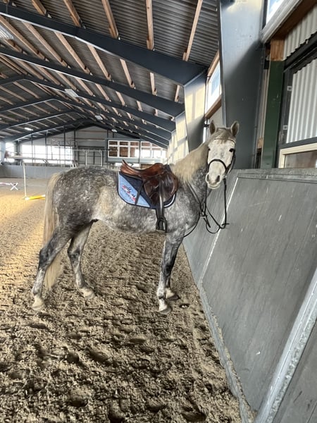 Zeer vriendelijk in de omgang, braaf. Maakt vliegende wissels in galop. Licht in de mond. Super karakter. Het paard is talentvol. Meer informatie via WhatsApp 🤗