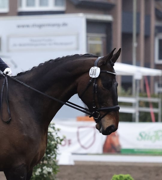 Devil's Darling, known as Döni Due to a diagnosis in the cervical spine, he is sold as conditionally rideable and at a significantly reduced price. A trial ride is not possible, as he is currently not being ridden. Please contact me privately for more information. He has competed successfully in dressage up to medium level (A*), and we have already started training with L-level exercises. He has never been promoted in show jumping, as I have no personal ambitions in that discipline. Döni is comfortable hacking alone and in a group, and is shoe- and loading-safe. He is not suitable for beginners. Current X-rays of the cervical spine and back are available. A recent health check (AKU) has not been performed.