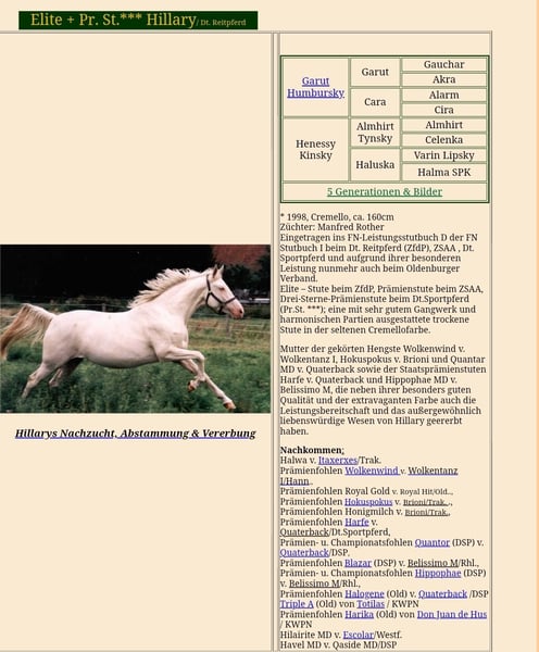 Die Palomino Escolar-Tochter Hiliarite MD, deren Mutter bereits drei gekörte Söhne, drei Staatsprämienstuten und mehrere Sporterfolgreiche Nachkommen hervorbrachte ist aktuell tragend vom Bundeschampion der 7jährigen SKY (03/26). Verkauf nur wegen überragender Nachzucht an Bestplatz. Die Stute hatte schon mehrere gut bezahlte Auktionsfohlen . 2. Generation gekörte Hengste: Wolkenwind v. Wolkentanz (SPR 1,40 m erfolgr.), Hokuspokus v. Brioni, Quantar MD v. Quaterback, Bosco v. Benicio Sportpferde: Triple A MD v. Totilas (DR S erfolgr.), Hippophae v. Belissimo M (DR S erfolgr.), Ti voglio bene v. Totilas (DR M erfolgr.), Stutenstamm gekörte Hengste: Dream in Gold v. Dream of Gold Mutter:Hiliarite MDZL:1/1 http://www.altmarkhof.com/ A top-class broodmare. Hiliarite MD is something very special with her lineage and color. She is a half-sister to three licensed stallions and several M and S successful sport horses. She has a cream gene and passes it on to her offspring at 50%. She is expecting a foal from Sky on March 26. There is therefore a great chance of calling a Palomino from Sky-Escolar your own.