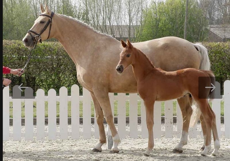 The Palomino Escolar daughter Hiliarite MD, whose mother has already produced three licensed sons, three state premium mares, and several successful sport offspring, is currently in foal to Sky for March 2026. Sale only due to outstanding offspring to the best home. The mare has already had several well-paid auction foals. 2nd Generation Licensed stallions: Wolkenwind by Wolkentanz (SPR 1.40 m successful), Hokuspokus by Brioni, Quantar MD by Quaterback, Bosco by Benicio Sport horses: Triple A MD by Totilas (DR S successful), Hippophae by Belissimo M (DR S successful), Ti voglio bene by Totilas (DR M successful), Mare line Licensed stallions: Dream in Gold by Dream of Gold Mother: Hiliarite MDZL:1/1 A top-class broodmare. Hiliarite MD is something very special with her lineage and color. She is a half-sister to three licensed stallions and several M and S successful sport horses. She has a cream gene and passes it on to her offspring at 50%. She is expecting a foal from Sky on March 26. Therefore, there is a great chance of calling a Palomino from Sky-Escolar your own.