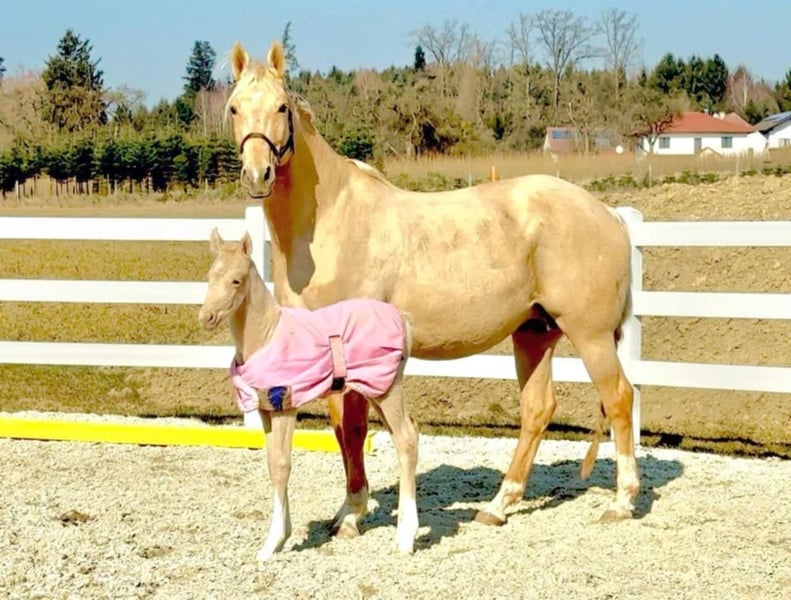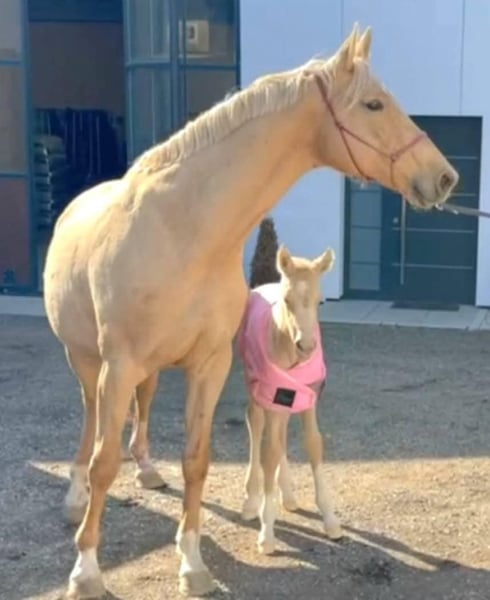 La fille Palomino Escolar Hiliarite MD, dont la mère a déjà donné naissance à trois fils agréés, trois juments primées d'État et plusieurs descendants ayant réussi dans le sport, est actuellement gestante de Sky pour mars 2026. Vente uniquement en raison d'une descendance exceptionnelle à un bon endroit. La jument a déjà eu plusieurs poulains de vente aux enchères bien rémunérés. 2ème génération Étalons agréés : Wolkenwind par Wolkentanz (SPR 1,40 m réussi), Hokuspokus par Brioni, Quantar MD par Quaterback, Bosco par Benicio Chevaux de sport : Triple A MD par Totilas (DR S réussi), Hippophae par Belissimo M (DR S réussi), Ti voglio bene par Totilas (DR M réussi), Lignée de juments Étalons agréés : Dream in Gold par Dream of Gold Mère : Hiliarite MDZL : 1/1 Une jument de reproduction de premier ordre. Hiliarite MD est quelque chose de très spécial avec son lignage et sa couleur. Elle est demi-sœur de trois étalons agréés et de plusieurs chevaux de sport ayant réussi en M et S. Elle possède un gène crème et le transmet à sa descendance à 50%. Elle attend un poulain de Sky le 26 mars. Il y a donc une grande chance de pouvoir appeler un Palomino issu de Sky-Escolar le vôtre.