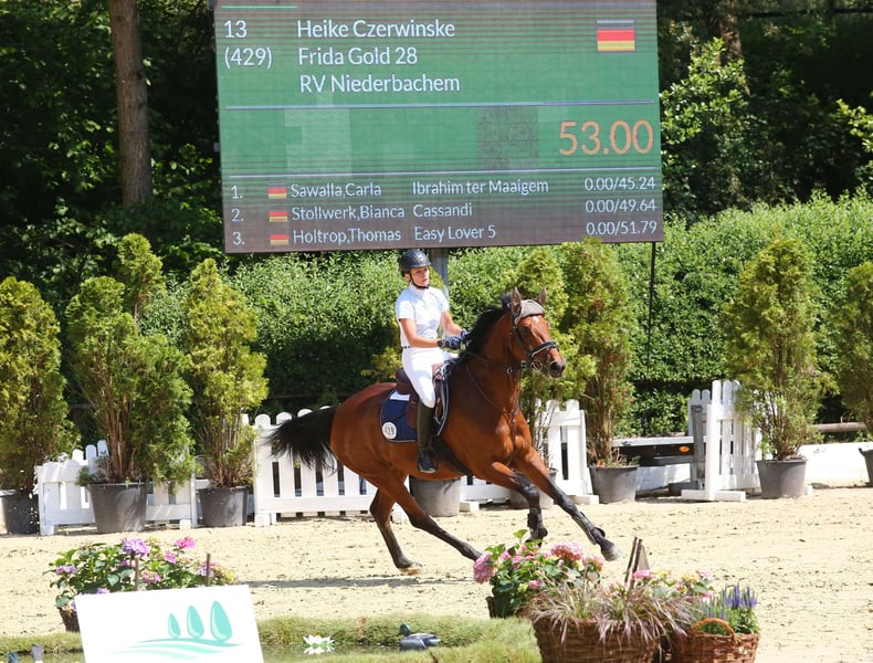 Frida Gold ist eine bildhübsche und wohlproportionierte Oldenburger Stute. Mit ihrer exzellenten Abstammung – väterlicherseits vom bekannten Dressurvererber Franziskus (Klimke) und mütterlicherseits bestem Trakehnerblut von Matador x Apart (von Angelo xx) – vereint sie beste Eigenschaften für Dressur und Springen. Sie ist ausgesprochen motiviert, zuverlässig und springt mit großer Freude. Auch in der Dressur zeigt sie dank ihrer geschmeidigen und ausdrucksstarken Grundgangarten Potenzial und ist stets fleißig und freudig bei der Arbeit. Sie eignet sie sich ideal für ambitionierte Umsteiger und Reiter, die vielseitiges Reiten schätzen. Im vergangenen Jahr bewies sie ihre Zuverlässigkeit und Souveränität sogar in E-Springen mit einem 11-jährigen Mädchen inkl. mehrerer Platzierungen. Frida Gold ist die perfekte Wahl für alle, die ein leistungsbereites, vielseitiges und charmantes Pferd suchen, das mit seinem Reiter oder Reiterin durch dick und dünn geht. Probereiten jederzeit möglich nach Absprache.