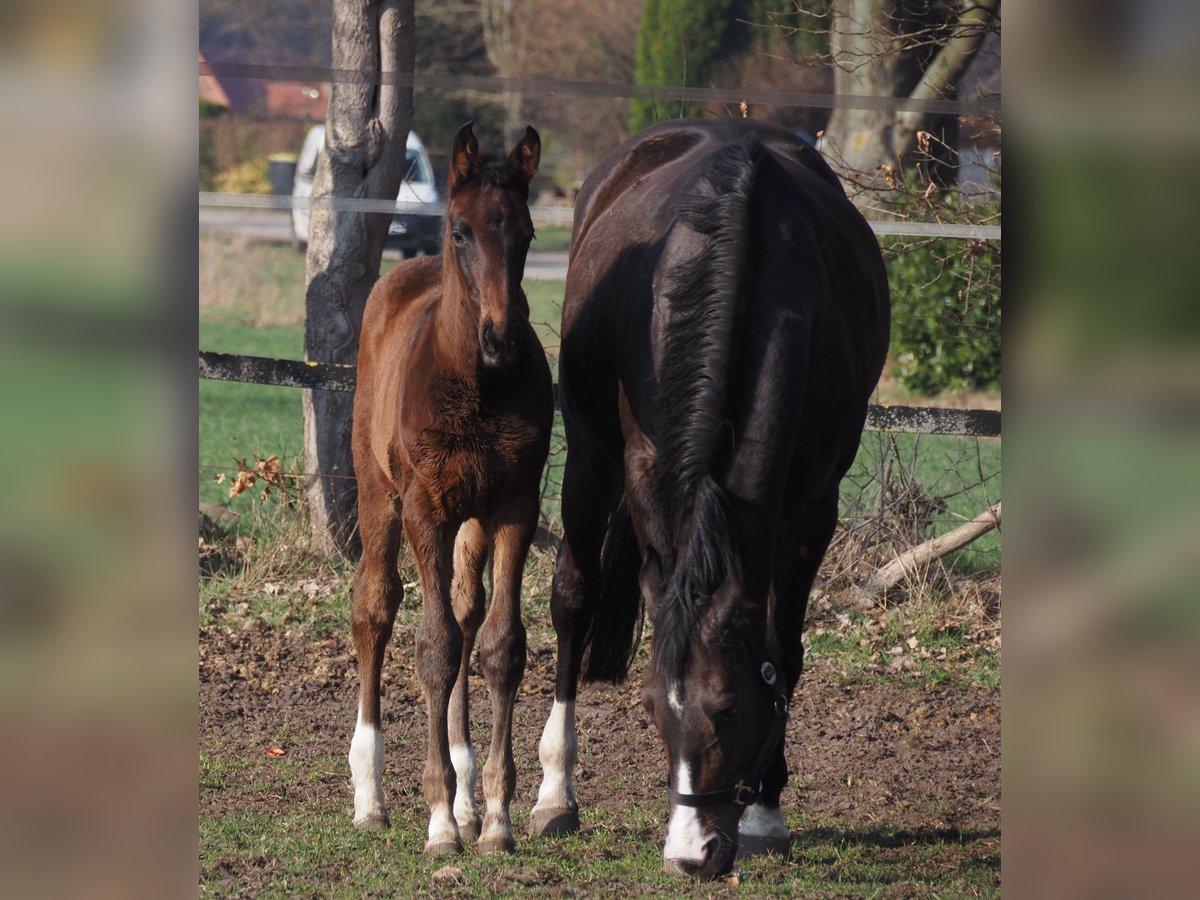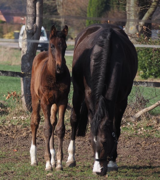 Elegant, lively mover in a dark brown jacket with four white socks. From an excellent dam line of mares. The dam herself is a premium Verband mare and also possesses outstanding movement! The sire, Cafe au Lait, is a winning stallion at his licensing, HLP champion, and finalist at the Bundeschampionate. He has competed successfully in the advanced classes and has gained a reputation in recent years as a top-quality sire with excellent offspring. Cafe's Casimir (Cafe au Lait x Calido x Grannus) was the top-priced lot at the Oldenburg Elite Auction, celebrated as a premium foal. At a young age, he already achieved multiple wins in S-dressage and has been successful internationally in Intermediaire I. Kasselmann’s Cafe's Caletta (Cafe au Lait x Calato) has also been placed in S-dressage and has achieved international Grand Prix success. Cafe's Matts (Cafe au Lait x Don Frederico) was the second-highest priced dressage horse at the Oldenburg Summer Mixed Sales. Additional young horses from spring-bred dam lines have repeatedly been placed in dressage competitions from A to M level and are notably expressive movers and mentally sharp. There is no doubt that Cafe au Lait’s offspring excel in show jumping up to the advanced level, as demonstrated by examples from our breeding program: - Cafe's Champus: licensed, vice-world champion of young horses - Cafe Junior: licensed, successful internationally in Saudi Arabia - Cafe's Columbo: licensed and successful in sport in France - Cafe's Don Rubin: licensed, bronze medalist at the Dobrocker Deister Championship at age 4 as the youngest horse, now 5 years old with multiple wins in L-level show jumping, placed in M, and qualified for the Bundeschampionate - Cafe's Deconi: licensed, just 3 years old, completed a 50-day performance test with scores up to 9.0! Standing with Paul Schockemöhle, Cafe au Lait has already sired several internationally successful show jumpers, including "Royce," winner of the FEI CSI5* $500,000 Rolex Grand Prix Wellington. Cafe au Lait himself was a Bundeschampionat finalist under Philipp Weishaupt and has competed successfully up to S*** jumping level. He is also equipped with three above-average GGA and has been trained in dressage to S level. Our foals receive daily mineral feed and foal starter, regular EQUISTRO Haemolytan and Ipaligo Foal supplements. Deworming and farrier visits are naturally routine. The broodmares are also fed special mare rations throughout pregnancy, daily haylage, linseed oil, and ad libitum hay. This ensures our offspring are always in excellent health. Further foals and young horses from our own breeding are available upon request. We also occasionally have some pregnant broodmares for sale. Video inquiries, etc., are only accepted via WhatsApp in advance!