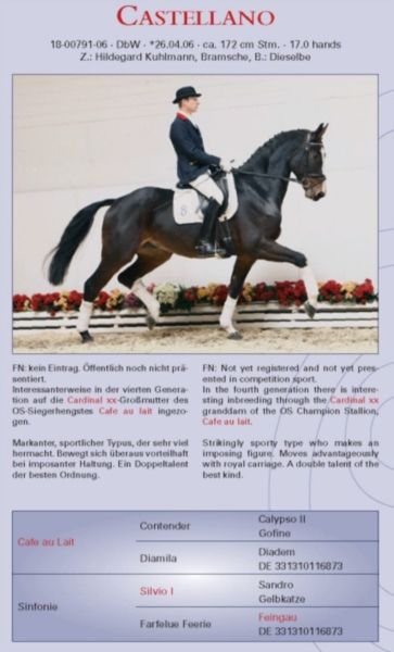 Ganggewaltige schicke Tänzerin in dunkelbrauner Jacke und vier weißen Söckchen. Aus besten Stutenstamm. Mutter selbst Verbandsprämienstute und ebenfalls außerordentlich bewegungsstark! Der Vater Cafe au lait, Siegerhengst seiner Körung, HLP Sieger und BuCha Finalist, war selbst siegreich in der schweren Klassen und hat sich in den letzten Jahren einen Namen als Doppelvererber mit Spitzennachzucht gemacht. So wurde Cafe's Casimir" (Cafe au lait x Calido x Grannus) gefeierte Preisspitze der Oldenburger Eliteauktion, ist bereits in jungen Jahren Seriensieger in S- Dressuren und international Intermediaire I siegreich. Stute Kasselmanns Cafe's Caletta (Cafe au lait x Calato) ist ebenfalls bereits S-Dressur platziert und international Grand Prix siegreich. Cafe's Matts (Cafe au lait x Don Frederico) wurde zweitteuerstes Dressurpferd der Oldenburger Summer Mixed Sales. Weitere Jungpferde aus springbetonten Mutterstuten sind bereits mehrfach in Dressurpferdeprüfungen A bis M platziert und sind bemerkenswert bewegungsstark und kopfklar. Dass die Cafe au lait Nachkommen im Springsport bis zur schweren Klasse überzeugen steht außer Frage, so zum Beispiel aus unserer Zucht: Cafe's Champus: gekört, Vizeweltmeister der jungen Pferde Cafe Junior: gekört, international erfolgreich in Saudi Arabien Cafe's Columbo: gekört und sporterfolgreich in Frankreich Cafe's Don Rubin: gekört, 4jährig als jüngstes Pferd Bronze beim Dobrocker Deisterchampionat, jetzt 5jährig mehrfach siegreich in Springpferde L, M platziert und qualifiziert zum BuCha. Cafe`s Deconi: gekört, grade 3jährig 50 Tage Leistungsprüfung mit Noten bis 9,0 abgelegt! Stationiert bei Paul Schockemöhle zeugte Cafe au lait schon etliche international erfolgreiche Springpferde, u.a. "Royce", siegreich im FEI CSI5* $500,000 Rolex Grand Prix Wellington. Cafe au lait selbst war unter Philipp Weishaupt Bundeschampionatsfinalist und ist bis S*** Springen erfolgreich gewesen, ist aber auch mit drei überdurchschnittlichen GGA ausgestattet und dressurmäßig auf S Niveau ausgebildet worden. Unsere Fohlen bekommen täglich Mineralfutter und Fohlenstarter, regelmäßig EQUISTRO Haemolytan und Ipaligo Foal. Wurmkuren und Schmied sind natürlich ebenfalls selbstverständlich. Auch die Muttertiere bekommen die ganze Trächtigkeit hindurch spezielles Stutenfutter, täglich Saftfutter und Leinöl, sowie Heu ad libitum. So ist unsere Nachzucht stets im besten Gesundheitszustand. Weitere Fohlen und Nachwuchspferde aus eigener Zucht auf Anfrage. Es stehen auch immer wieder einige tragende Zuchtstuten zum Verkauf. Videoanfragen etc. ausschließlich vorab über WhatsApp möglich!