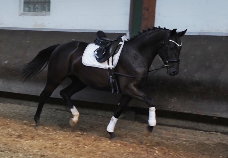 Eine weitere bildschöne bewegungsstarke 2,5jährige Tochter des Kör- und HLP-Siegers "Cafe au lait", der schon seit einigen Jahren durch seine unheimlich erfolgreiche Nachzucht im Dressur- und Springsport der schweren Klasse auf sich aufmerksam macht! Sowohl durch den Vater als auch durch die züchterisch erprobte und beidseitig veranlagte Mutter, die zudem auch über den nötigen Blutanschluss verfügt, empfiehlt sich diese elegante lackschwarze Stute für den Dressur- und Springsport, sowie den Vielseitigkeitssport gleichermaßen. Beim Freispringen überzeugt sie auf ganzer Linie durch unheimlich viel Übersicht, Vorsicht und Vermögen! Zwei ausgesprochen qualitätsvolle Vollgeschwister sind bereits verkauft und ebenfalls sehr bewegungsstark und springtalentiert! Diese schicke Stute steht im mittleren Rahmen, Stckm. zur Zeit 1,61m, Endmaß ca. 1,64m, daher das ideale Damen- und Juniorenpferd. Deckt sehr gut auch größere Reiter ab. Da sie im Dezember 22 geboren ist, zählt sie offiziell zum Jahrgang 23. Altersentsprechend wird sie zur Zeit angeritten und zeigt sich dabei absolut artig und leichtrittig. Auch von schwächeren Reitern zu händeln. Selbst im Dunkeln kann man mit ihr spazieren reiten. Cafe au lait selbst war unter Philipp Weishaupt Bundeschampionatsfinalist und ist bis S*** Springen erfolgreich gewesen, ist aber auch mit drei sehr guten GGA ausgestattet und dressurmäßig auf S Niveau ausgebildet worden. Stationiert bei Paul Schockemöhle zeugte er schon etliche international erfolgreiche Springpferde, u.a. "Royce", siegreich im FEI CSI5* $500,000 Rolex Grand Prix Wellington. Der aus unserer Zucht stammende gekörte Cafe's Champus wurde unter Rene Tebbel Vizeweltmeister der jungen Pferde. Ebenfalls alle gekört und aus unserer Zucht: Cafe Junior (Cafe au lait x Silvio I), international S*-Springen platziert. Cafe's Columbo (Cafe au lait x Belstaff), erfolgreich in Frankreich. Cafe`s Star (Cafe au lait x Calido I): gekört und S-Springen erfolgreich im Iran. Cafe's Don Rubin (Cafe au lait x Donnerhall), siegreich in seinen ersten Springpferdeprüfungen, 4jährig als jüngstes Pferd Bronze beim Dobrocker Deisterchampionat Weitere Jungpferde aus springbetonten Mutterstuten sind bereits mehrfach in Dressurpferdeprüfungen A bis M platziert und sind bemerkenswert bewegungsstark und kopfklar. Auch im großen Viereck überzeugen die "Cafe's" auf ganzer Linie: So wurde Cafe's Casimir" (Cafe au lait x Calido x Grannus) gefeierte Preisspitze der Oldenburger Eliteauktion, war bereits in jungen Jahren Seriensieger in Dressurpferde M, 7jährig in seinen ersten S- Dressuren wieder Seriensieger! Mittlerweile ist er in S** und international Intermediaire I siegreich. Stute Kasselmanns Cafe's Caletta (Cafe au lait x Calato) ist ebenfalls bereits S-Dressur und international Grand Prix siegreich. Cafe's Matts (Cafe au lait x Don Frederico) wurde Vizepreisspitze bei den Dressurpferden der Oldenburger Summer Mixed Sales. Alle Nachkommen zeichen sich durch hohe Rittigkeitswerte, Traumcharakter und Doppelveranlagung aus! Unsere Fohlen bekommen täglich Mineralfutter und Fohlenstarter, regelmäßig EQUISTRO Haemolytan und Ipaligo Foal, Wurmkuren und Schmied sind natürlich ebenfalls selbstverständlich. Auch die Muttertiere bekommen die ganze Trächtigkeit hindurch spezielles Stutenfutter, täglich Saftfutter und Leinöl, sowie Heu ad libitum. So ist unsere Nachzucht stets im besten Gesundheitszustand! Weitere Fohlen und Nachwuchspferde aus eigener Zucht auf Anfrage. Ein Teil ist unter den anderen Anzeigen zu finden. Bei uns fallen jedes Jahr um die 20 Cafe au lait Fohlen. Es stehen auch immer wieder einige tragende Zuchtstuten zum Verkauf. Cafe`s Rosemarie verfügt bereits über aktuelle sehr gute Röntgenbilder. Videoanfragen vorab ausschließlich via WhatsApp möglich.
