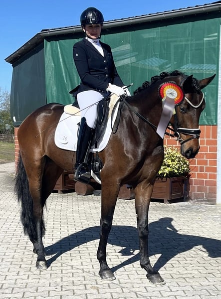 ⚜️ EHRENTANZ ⚜️ Bei uns geboren war Ehrentanz schon immer ein sehr unkompliziertes Pferd. Sie war nie krank und wurde bei uns vor wenigen Monaten entspannt angeritten. Auch dabei zeigte sie sich stets total ruhig und belastbar. Deshalb ging sie jetzt im April auf ihrem ersten Turnier an den Start und konnte sich sofort den 2. Platz 🥈 sichern. Dabei erhielt sie die 8,0 für die Rittigkeit & den Galopp. Sie ist total unerschrocken und cool auf dem Turnier, wie auch zu Hause. Ehrentanz hat sehr gute Röntgenbilder inklusive Rücken ohne Befunde und ist auch klinisch einwandfrei. Auf Anfrage kann ich das komplette Turniervideo, sowie die Röntgenbilder vorab zur Einsicht zukommen lassen. Ein Termin zum Kennenlernen & Proberreiten kann jederzeit vereinbart werden