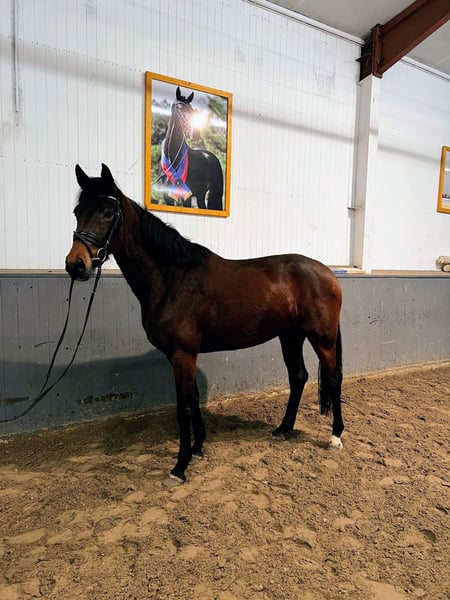 Zum Verkauf steht eine 4-jährige Stute von Vaderland x Sandro Hit x Donnerschwee, geboren am 30.05.2022, mit einem Stockmaß von ca. 1,67 m. Sie stammt aus dem renommierten Rudilore-Stamm, aus dem seit Jahren erfolgreich gezüchtet wird. Die Mutter ist Vollschwester zum gekörten Showdancer. Aus dem Stamm gingen bereits mehrere sportlich hochinteressante Pferde hervor: Zwei Fohlen wurden an Blue Horse verkauft Eine Stute erzielte einen Preis von 80.000 € in Vechta Weitere Pferde aus dem Stamm laufen erfolgreich in den USA, u. a. Babylon Berlin Die Stute befindet sich seit Anfang des Jahres unter dem Sattel und zeigt sich dabei sehr unerschrocken und gelassen beim Reiten. Die GGA sind gut. Besonders hervorzuheben ist ihr toller Charakter: Sie möchte dem Reiter stets gefallen und ist sehr kooperativ. Wichtig: Sie ist nicht für reine Anfänger geeignet, da sie noch ganz am Anfang ihrer Ausbildung steht. Ein ideales Damenpferd mit sehr interessanter Abstammung und Perspektive. Wir wünschen uns für sie ein ganz, ganz tolles Zuhause, daher gilt Platz vor Preis. Bei ernsthaftem Interesse freuen wir uns über eine Nachricht.