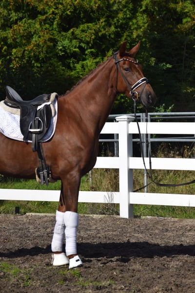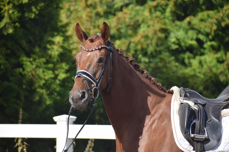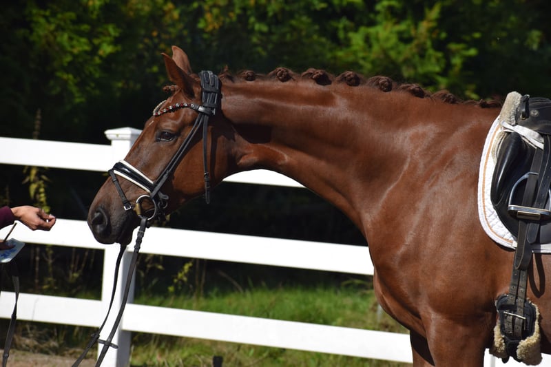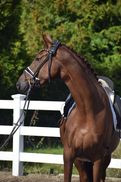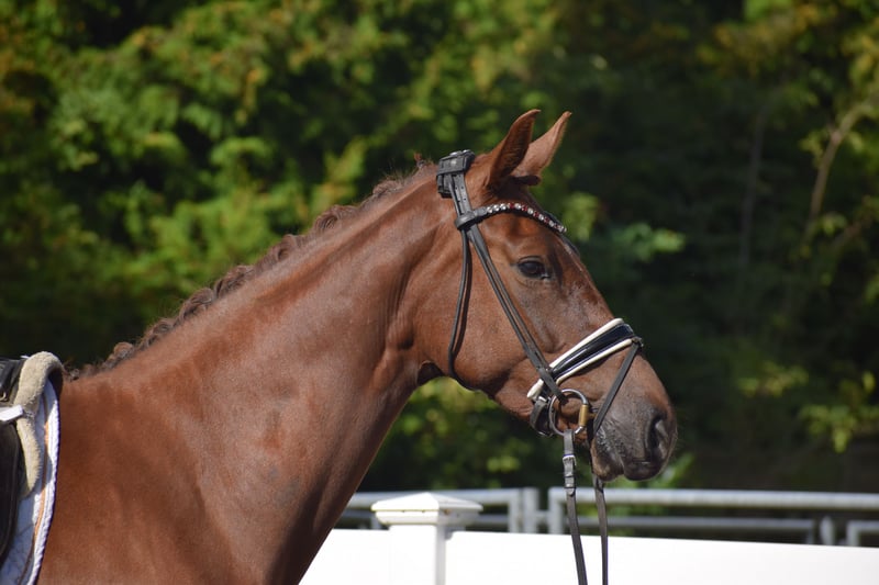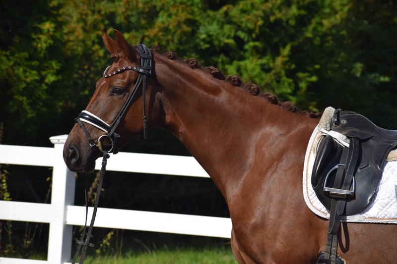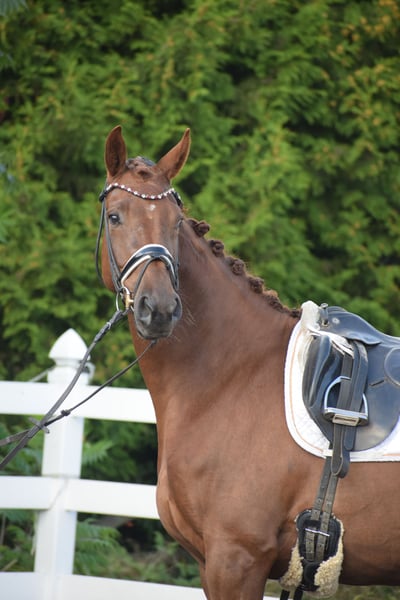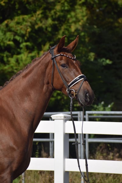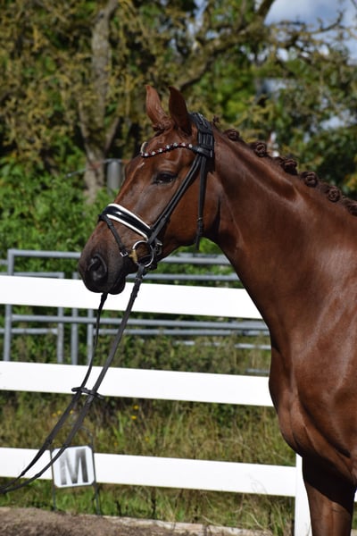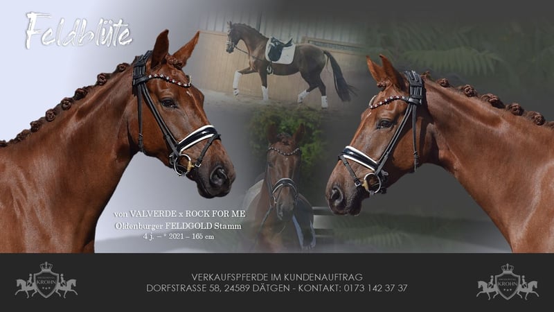 BEEINDRUCKEND BALANCIERTE 4 J. STUTE MIT ABSOLUT RUHIGEM & EHRLICHEN CHATAKTER - EIN TRAUM FÜR JEDEN DER FREUDE AM REITEN HABEN WILL - Junioren geeignet! Feldgoldstamm! Liebenswerte 4 j., 167 cm, ausgeglichene, Oldenburger Dunkelfuchsstute aus dem dirketen Feldgoldstamm von VALVERDE x ROCK FOR ME. „FELDBLÜTE“ besticht mit Optik, Charakter und beeindruckend gelassener Rittigkeit. Sie verfügt über drei gut balancierte Grundgangarten mit sehr guter Anlehnung. Sie besticht ebenfalls mit gutem Exterieur, harmonischer Gebäudeaufteilung, auffällig schönem Kopf und Seitenbild. Setzt sich „FELDBLÜTE“ in Bewegung, wird klar das sich hier ein Leistungsbereites, fein zu reitendes, gut balanciertes Pferd zeigt, welches es auch einem Amateur leicht machen wird, in Turnier- oder Abzeichenprüfunbgen, direkt fuss zu fassen. „FELDBLÜTE“ befindet sich seid dem einreiten im professionellen Beritt, konnte parallel jedoch immer schon von der Tochter des Besitzers mitgeritten werden. Sie befindet sich auf Dressurpferde A Niveau und lässt sich in fremder Umgebung von verschiedenen Reitern problemlos und unerschocken reiten. Sie hat freude an der Arbeit und könnte sofort in Reitpferde- & Dressurpferde A Prüfungen vorgestellt werden. „FELDBLÜTE´S“ Charakter lässt keine wünsche offen. Sie ist absolut ruihig, umgänglich, verschmust und dem Menschen sehr zugewandt. Sie hat ein absolut angenehmes ruhiges Wesen und ist mit anderen Pferde sehr sozial. Aufgrund ihrer ausgezeichneten Abstammung ist „FELDBLÜTE“ auch für die Zucht hochinteressant. Gerne kann „FELDBLÜTE“ nach dem Kauf bei uns im professionellen Beritt verbleiben. Ein aktueller, guter Röntgen-Tüv + klinischer Untersuchung liegt vor.