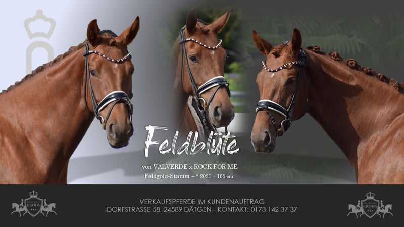 IMPRESSIVE LOVELY MARE WITH ABSOLUTELY CALM & HONEST CHARACTER - A DREAM FOR ANYONE WHO WANTS TO ENJOY RIDING - Suitable for juniors! For sale on behalf of the breeder is this lovable, balanced young horse from the direct Feldgold line of VALVERDE x ROCK FOR ME. Due to her pedigree, she is also extremely interesting for breeding. "FELDBLÜTE" impresses with her appearance, character, and remarkably relaxed rideability. She possesses three well-balanced basic gaits with very good connection, considering her young age. She also stands out with good conformation, a strikingly beautiful head, and profile. When "FELDBLÜTE" moves, it becomes clear that she is a performance-ready, easy-to-ride, well-balanced horse, which will also make it easy for an amateur to establish themselves in competitions or badge tests. "FELDBLÜTE" comes directly from the breeder's home and has been in professional training since being backed, but has always been ridden by the breeder's daughter in parallel. She is backed and is at riding horse level. Despite her young age, she can be ridden easily and calmly by different riders in unfamiliar environments. She enjoys working and could be presented in riding horse competitions immediately. "FELDBLÜTE's" character leaves nothing to be desired. She is absolutely calm, sociable, affectionate, and very people-oriented. She has a very pleasant, calm demeanor and is very social with other horses. Due to her excellent pedigree, "FELDBLÜTE" is also highly interesting for breeding. We wish this uncomplicated horse a loving home. "FELDBLÜTE" can remain in our professional training after purchase. A current, good vet check with 18 X-rays + clinical examination is available.
