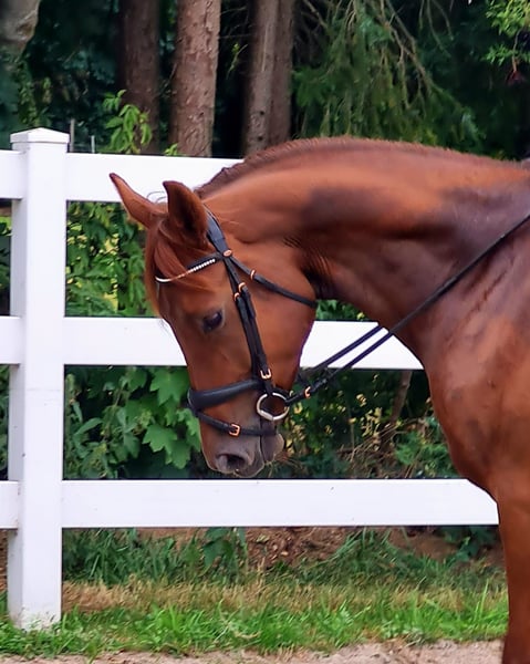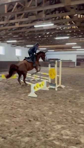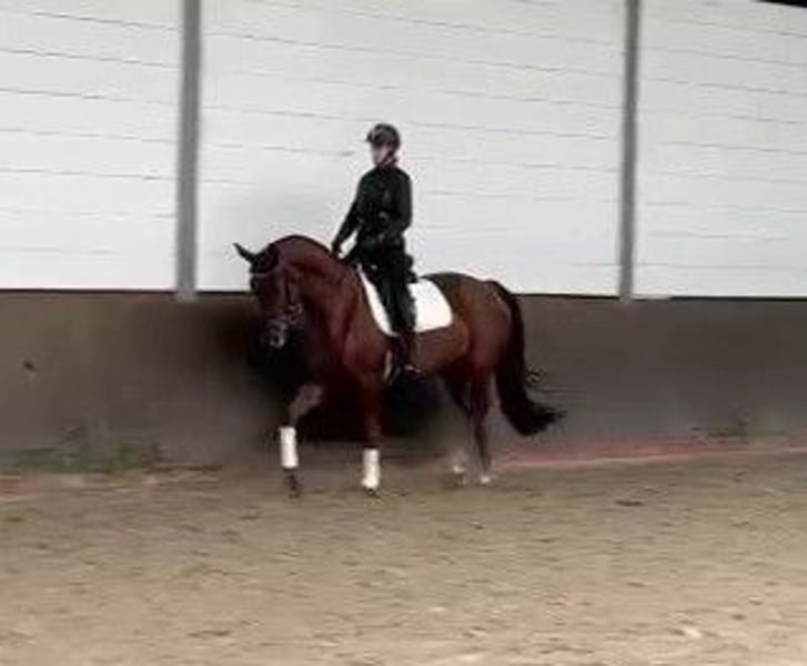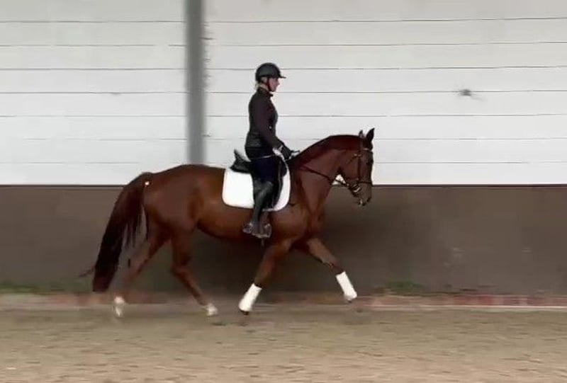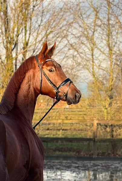 I am offering a beautiful 4-year-old chestnut mare by Fiedertanz. I personally bred First Edition HK (Fehnja), and she is now ready to move to a new home where she can continue to develop. Fehnja has been gently backed and is currently at a dressage horse level: A. She has a lot of charm, an excellent character, is very people-oriented, and eager to do everything right. She possesses good gaits and is comfortable to ride. She also enjoys jumping with enthusiasm and motivation. If you are looking for a sport partner, you will definitely find one in her. Overall, a promising young horse with great potential for many wonderful years together! Fehnja has a recent veterinary exam / X-ray images, including the back and neck. I look forward to your visit!