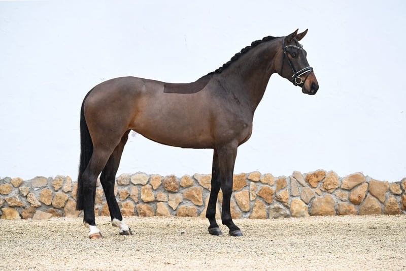 Typey 5-year-old mare Sired by Cadeau Noir x Fürst Romancier x Spörcken. Broke late, currently competing at PSG Level. In our opinion, a very promising dressage horse with above-average gaits and a good work attitude. In person, she exudes charm and presence, which doesn’t fully come across in the video. We warmly invite you to visit us in 97285 Röttingen to see her in person. Valid health certificate available. Approx. 16.1 hh. Please contact us by phone at 0179 7002982.