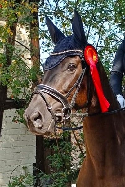 Deze charmante en talentvolle merrie overtuigt niet alleen door haar elegante exterieur, maar vooral door haar talent en uitstraling in de dressuurbaan. Ze is al voorgesteld en geplaatst in Dressuurpaard A en kan terugkijken op goede scores in haar eerdere proeven. Momenteel wordt ze speels weggeleid naar de oefeningen van dressuurpaard L. Haar energieke, expressieve draf en haar krachtige, bergop gesprongen galop, evenals haar ritmische stap, bieden alles wat men van een jonge dressuurpaard voor de hogere sport verlangt. In concoursverband toont ze zich uiterst betrouwbaar, is ze braaf, nervensterk en ook solo in de ring zeer zelfverzekerd. Daarnaast is ze geschikt voor het terrein, schoeisel- en trailer-vrij. Ook recreatieruiters zullen plezier aan haar beleven: ze toont zich altijd betrouwbaar, heeft al positieve ervaringen opgedaan met jonge ruiters en gedraagt zich steeds braaf en makkelijk in de omgang. Deze 5-jarige dressuurmerrie brengt talent, leergierigheid en dat beetje extra mee om in de hogere dressuursport te schitteren – maar tegelijk ook een betrouwbare partner voor dagelijks gebruik. Een korte video geeft een eerste indruk van haar bewegingen en kwaliteit onder het zadel. Bij interesse of voor meer informatie sta ik graag voor u klaar. Een proefrit is in overleg mogelijk. Neem gerust contact op voor meer informatie over dit veelbelovende paard!