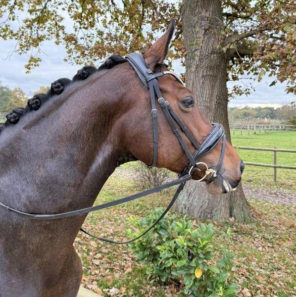 For sale is a 9-year-old Oldenburg mare by Quantensprung. Qara is a stunning and eager-to-learn mare that already moves confidently at M** level at home and has mastered many elements of the S* class. She boasts three very good gaits, with her walk being particularly outstanding, earning an 8.5 in dressage horse tests. She has successfully competed in the Young Rider division at L** level / Children’s Tour, achieving numerous top placements with scores of over 73% in some classes. At competitions, she is always focused and eager to please her rider. In show jumping, Qara has not yet been competed. At home, she confidently jumps an L-class course, even with a less experienced rider. She also regularly goes out on cross-country rides and does so with great calmness. Qara will bring her new rider a lot of joy!