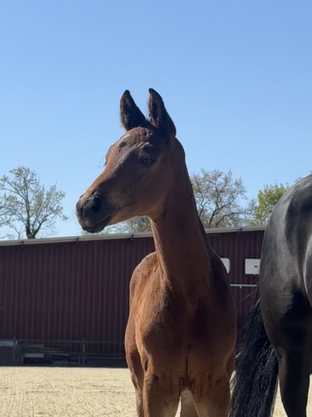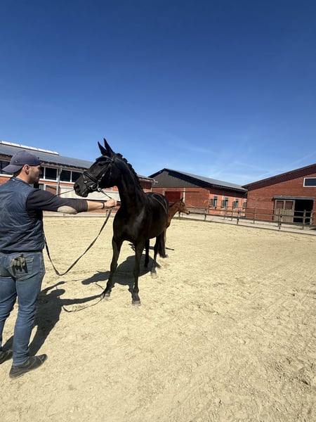 Wegen Reduktion unserer Zucht steht diese wunderschöne schwarze Perle samt Fohlen und wieder tragend zum Verkauf. Abstammung: Stute: Finest - Relevant - De Niro Hengstfohlen: Viva Vegas (Viva Gold OLD, Vivaldi x For Romance x Don Schufro), geboren Ende Februar Embryo: V-Power (Viva Gold x Fidertanz) Hier vereinen sich einige der besten Dressurpferdevererber der Welt! Die Stute hatte bei uns drei wunderschöne Fohlen, hat jedes Mal unkompliziert aufgenommen und ist eine gute Mutterstute. Sie ist absolut unkompliziert im Umgang und lebt bei uns im Herdenverband mit mehreren Stuten und Fohlen. Mit ihren 9 Jahren ist sie im absolut besten Alter und könnte sogar noch einmal geritten werden. Für das nächste Jahr ist sie tragend von V-Power, der mit Isabell Werth im Sattel derzeit Furore macht und allgemein als Fohlenmacher gilt. Bei Fuß hat sie ein wunderschönes Hengstfohlen von Viva Vegas. Geboren Ende Februar zeigt auch er sich sehr vielversprechend. Sein Vater gilt als einer der großen Nachwuchshoffnungen im Hause Blue Horse. Standort: 49393 Lohne Besichtigung nach Absprache jederzeit möglich. Der Preis versteht sich für Stute mit Hengstfohlen und dem Fohlen für 2027. Das wäre unsere bevorzugte Variante. Über Einzelkäufe kann man sprechen. Weitere Infos gerne unter 0171/2069704