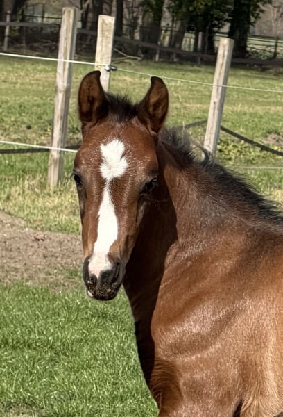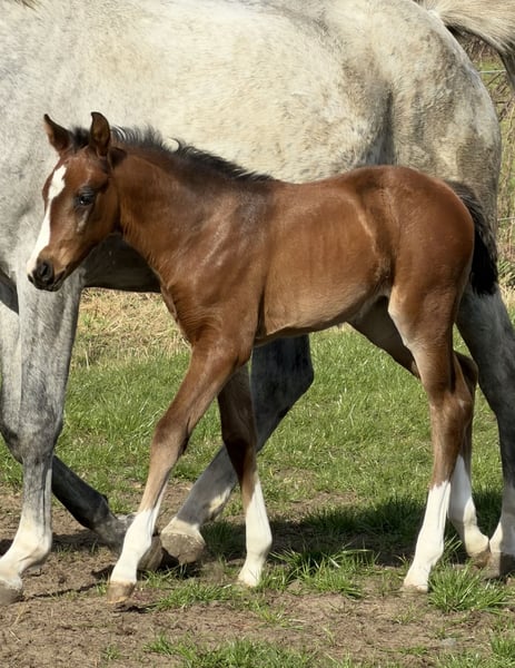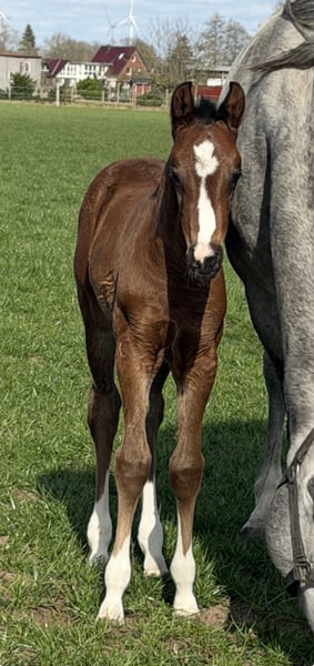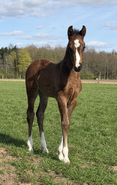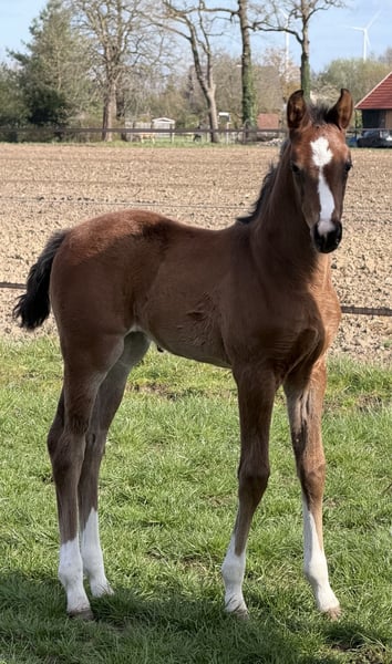 Außerordentlich typvolle bunte Totilas Enkelin aus Embryotransfer mit Doppelveranlagung. Mutter (dunkelbraun) selbst Dressurpferdeprüfungen A und L platziert bis sie in die Zucht wechselte. Ein Vollbruder dieses schicken Stutfohlens aus dem letzten Jahr entwickelt sich zu einem überaus bewegungsstarken Hengstanwärter. Ein weiteres Fohlen identischer Abstammung wird dieses Jahr noch erwartet. Der Vater Cafe au lait, Siegerhengst seiner Körung, HLP Sieger und BuCha Finalist, war selbst siegreich in der schweren Klassen und hat sich in den letzten Jahren einen Namen als Doppelvererber mit Spitzennachzucht gemacht. So wurde Cafe's Casimir" (Cafe au lait x Calido x Grannus) gefeierte Preisspitze der Oldenburger Eliteauktion, ist bereits in jungen Jahren Seriensieger in S- Dressuren und international Intermediaire I siegreich. Stute Kasselmanns Cafe's Caletta (Cafe au lait x Calato) ist ebenfalls bereits S-Dressur platziert und international Grand Prix siegreich. Cafe's Matts (Cafe au lait x Don Frederico) wurde zweitteuerstes Dressurpferd der Oldenburger Summer Mixed Sales. Weitere Jungpferde aus springbetonten Mutterstuten sind bereits mehrfach in Dressurpferdeprüfungen A bis M platziert und sind bemerkenswert bewegungsstark und kopfklar. Dass die Cafe au lait Nachkommen im Springsport bis zur schweren Klasse überzeugen steht außer Frage, so zum Beispiel aus unserer Zucht: Cafe's Champus: gekört, Vizeweltmeister der jungen Pferde Cafe Junior: gekört, international erfolgreich in Saudi Arabien Cafe's Columbo: gekört und sporterfolgreich in Frankreich Cafe's Don Rubin: gekört, 4jährig als jüngstes Pferd Bronze beim Dobrocker Deisterchampionat. Jetzt 5jährig mehrfach siegreich in Springpferde L, M platziert und qualifiziert zum BuCha Cafe`s Deconi: gekört, grade 3jährig 50 Tage Leistungsprüfung mit Noten bis 9,0 abgelegt! Stationiert bei Paul Schockemöhle zeugte Cafe au lait schon etliche international erfolgreiche Springpferde, u.a. "Royce", siegreich im FEI CSI5* $500,000 Rolex Grand Prix Wellington. Cafe au lait selbst war unter Philipp Weishaupt Bundeschampionatsfinalist und ist bis S*** Springen erfolgreich gewesen, ist aber auch mit drei spektakulären GGA ausgestattet und dressurmäßig auf S Niveau ausgebildet worden. Unsere Fohlen bekommen täglich Mineralfutter und Fohlenstarter, regelmäßig EQUISTRO Haemolytan und Ipaligo Foal, Wurmkuren und Schmied sind natürlich ebenfalls selbstverständlich. Auch die Muttertiere bekommen die ganze Trächtigkeit hindurch spezielles Stutenfutter, täglich Saftfutter und Leinöl, sowie Heu ad libitum. So ist unsere Nachzucht stets im besten Gesundheitszustand. Weitere Fohlen und Nachwuchspferde aus eigener Zucht auf Anfrage. Es stehen auch immer wieder einige tragende Zuchtstuten zum Verkauf. Videoanfragen etc. ausschließlich vorab über WhatsApp möglich!