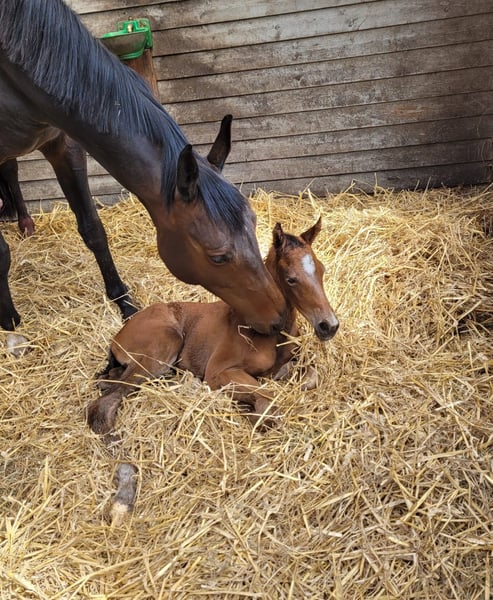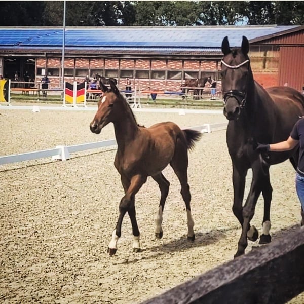 Sei von Anfang an mit dabei! Dante Weltino - Enzo Ferrari Wir erwarten im Mai 2026 ein Fohlen aus unserer Happy Sara, von dem Olympia-Hengst Dante Weltino OLD. Aus dieser Anpaarung erhoffen wir uns ein leistungsstarkes Nachwuchspferd mit Potential bis zur höchsten Klasse. (Da Dante Weltino ein reinerbiger Rappe ist, erwarten wir ein dunkles Fohlen! Also keinen Fuchs, und es kann auch ein Rappe fallen!) Der Vater des Fohlens gehörte mit seiner Ausbilderin Therese Nilshagen von 2016 bis 2024 ununterbrochen dem Schwedischen Championatsteam an, gewann in dieser Zeit zweimal EM-Teambronze und stand bei insgesamt zwei Olympischen Spielen, zwei Welt- und vier Europameisterschaften jeweils im Finale. 14-mal platzierte er sich dabei unter den Top Ten. 2025 wurde der 18-jährige topfit aus dem Sport verabschiedet. Damit beweist Dante Weltino seine Haltbarkeit und Gesundheit. Seine zugleich sehr starke Leistungsbereitschaft gibt er laut seiner Reiterin auch an seine Nachkommen weiter. Unsere Happy Sara ist eine Stute zum Liebhaben - bewegungsstark, leistungsbereit und dabei charakterlich einwandfrei zeigt sie sich immer mit viel Respekt und Liebe gegenüber dem Menschen, was sie auch an ihre Fohlen weitergibt. Ihre zweijährige Tochter zeigt sich bereits sehr zutraulich, und auch ihr prämiertes Hengstfohlen vom letzten Jahr begeistert durch seinen Charakter, seine GGA und glänzte mit seiner Händelbarkeit auf der Fohlenschau. Happy selber lief bereits auf dem Turnier, gewann dabei Dressurpferde A und war in Dressurpferde L platziert. Ihre Verwandtschaft glänzt mit Leistung im Viereck, direkte Geschwister sind u.a. platziert bis S-Dressur und mit Noten bis 9 in M-Dressuren platziert. Auch ihr Stutenstamm kann Erfolge bis Grand Prix, gekörte Hengste und Auktionspferde vorweisen, z.B. auch die Grand Prix und Weltcup platzierte Stute Soiree D'Amour OLD. Bild 1-5 sind Happy (teils mit ihrem Fohlen aus 2025), Bild 6 ist ihr Fohlen aus 2025. Gerne werden schon Bewegungsvideos geteilt, auch wenn wir momentan noch keine "professionellen" Videos haben. Bei Interesse meldet euch gerne, Preis auf Anfrage!