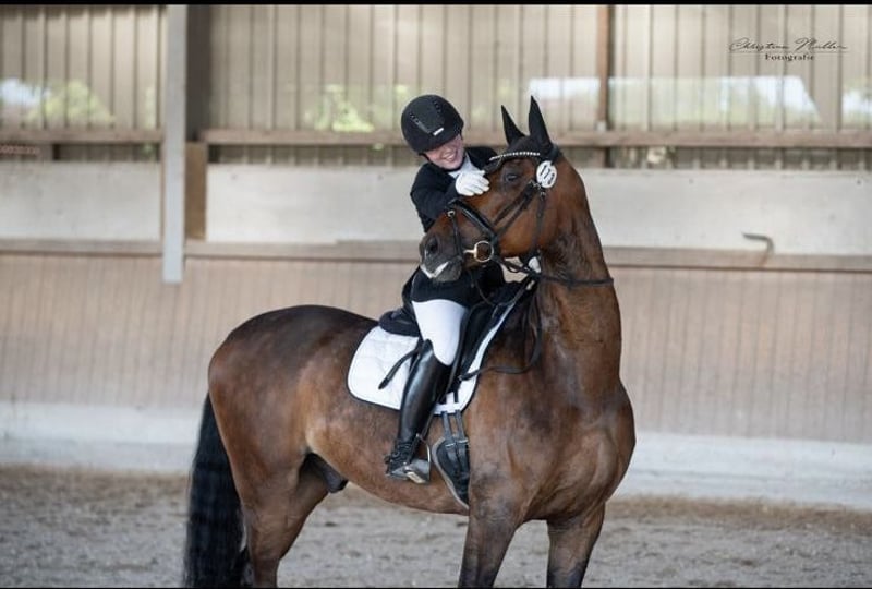 Carefully raised by the breeder, Berny has been slowly and sustainably started and trained due to his size and his spacious, highly elastic basic gaits. He is now ready for tasks in the large arena. He is currently being trained by a very talented 17-year-old rider in cooperation with her S** successful trainer. In all aspects of daily handling, he is very well-behaved and easy to manage. Initial competition starts have been completed. Feel free to ask any questions; further videos can be created and sent. However, the best way is to get to know him in person.