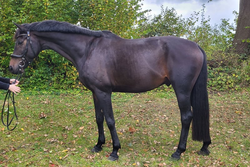 For sale is an Oldenburg gelding by Jazzman x Lauries Crusador xx x Dormello. The gelding has been trained in dressage and has shown to be fearless both in the field and during off-site training. He is herd-compatible and well-behaved for the farrier and loading. He is currently recovering from an injury to his support ligament and may be able to be ridden again afterwards. This horse needs "his" person, for whom he is ready to give everything. He loves routines and interacts with people in his very gentle way, making him a great partner, especially for all types of groundwork. A handsome type that shines with outstanding gaits. A previously healed tendon injury has not caused him any issues afterward. The gelding requires a somewhat specialized management due to a respiratory issue and MIM and will only be sold to a suitable home with all-day turnout.