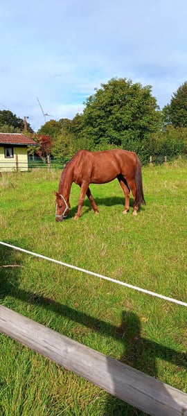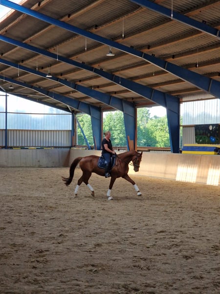 Das Pferd wurde vor 7 Jahren für meine erwachsene Tochter gekauft und viel von uns geritten, auch im Gelände. Nun ist sie seit anderthalb Jahren im Ausland und ich fühle mich alleine nicht so wohl mit ihm, wie es bei diesem Hobby sein sollte. Da ich nicht absehen kann, wann sie wiederkommt, habe ich mich schweren Herzens entschieden, ihn in gute Hände zu geben. Er verfügt über 3 sehr schöne Grundgangarten, etwas Vielseitigkeitserfahrung sowie über ein großes Springvermögen, das jedoch Überzeugungsarbeit erfordert. Da er aber eher der Typ Ferrari ist, muss man sehr darauf achten, ihn beim reiten ruhig zu halten. Dabei muss der Reiter sehr viel mit dem Körper und weniger mit dem Zügel arbeiten, da das Pferd sich sonst dem Zügeldruck entzieht und dazu neigt, sich einzurollen. Aufgrund dessen ist dieses Pferd auf keinen Fall für Kinder oder Anfänger geeignet. Er testet auch gerne mal, wie dominant er sein kann. Dieser Wallach verfügt über sehr viel Energie, die sich manchmal auch geballt entlädt. Er passt aber beim longieren sehr auf, dass er den Longenführer dabei niemals bedrängt. Beim reiten ist er sehr bemüht, nicht zu bocken. Er ist generell etwas guckig. Er ist auch sehr liebebedürftig und kuschelt gerne, er möchte gefallen und alles richtig machen. Er kennt Dressurarbeit, springen, Handarbeit, Bodenarbeit, Anti-Schreck-Training, Longe, Gelände Ich wünsche mir für ihn jemanden, der diese Herausforderung annehmen möchte und in den richtigen Händen ist er ein Rohdiamant. Er ist kerngesund und es zählt ganz klar Platz vor Preis