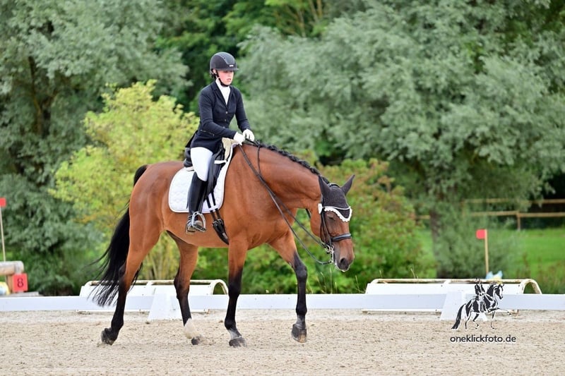 An impressive Oldenburg gelding is for sale. This handsome bay impresses with a height of 178 cm and is a real eye-catcher. He is always decent when ridden, can be relied upon to go out alone or in a group, and also enjoys jumping a small course (also with a dressage rider). His dressage training level is M-ready (unfortunately the videos are a little older). With his excellent training and elegant appearance, he is the ideal partner for any ambitious rider. Due to his pedigree-appropriate - always adjustable - go, he is also ideal for an eventing rider. He is well-behaved and knows his way around a horse walker, paddock and paddock. If you are looking for a talented and experienced riding horse that is convincing both in the arena and in everyday handling, then he could be just the right horse for you. Here is a youtube link: https://www.youtube.com/watch?v=mZDy4KLL4hg For further information and to arrange a viewing appointment, please contact us.