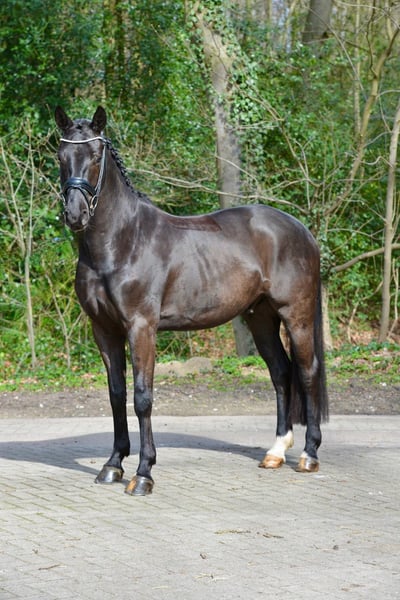 "Dimpel" is a medium-sized (16.1 hh), four-year-old gelding from our breeding program. He has three evenly matched, very good basic gaits, plenty of hindquarter activity, and, despite his youth, already demonstrates excellent rideability and balance. Equipped with a lot of natural impulsion, he consistently appears focused and motivated. He has been under saddle for nearly six months, has not yet been shown publicly, but is on a solid training path, so he could confidently make his first competitive appearances in Dressage Horse A level later this year. Very friendly and human-oriented, he is comfortable on small hacks in the terrain as well as working over poles and cavaletti. He is farrier- and loading-friendly and always displays a trusting attitude with a positive outlook towards new experiences. With further training, this promising young horse will develop into an excellent competition prospect.